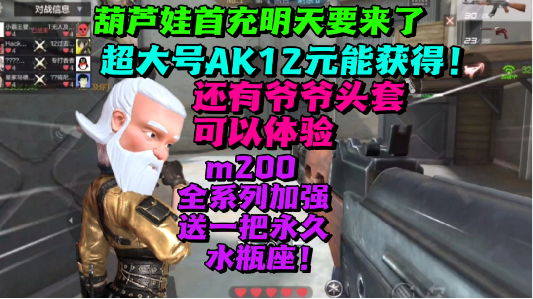 葫芦娃首充AK超大号12元可以获得,50元可以弄到2000赏金令积分,还有爷爷头套可以体验,以及一些钻石等等,m200全系列加强,明天还送一把永久的m200!