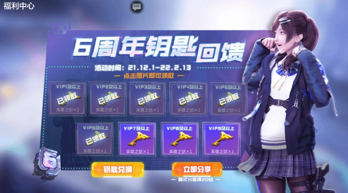 HELLO,各位看官大家好啊,欢迎来到本期的活动杂谈。今天来聊一聊六周年钥匙回馈,钥匙回馈这个活动一般是过年的时候才出的,但是因为玩家的呼声非常高,现在将钥匙回馈的活动提前到了12月1日,让大家提前免费拿一波钥匙,简直不要太爽。【活动简介】活动时间:2021年12月1日-2022年2月13日。如此之长的时间,翻阅了一下日历,二月十三已经是农历正月十三了。意味着这次的钥匙回馈持续到了过年,这一波