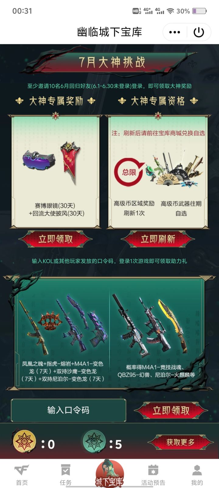 幽临城下宝库兑换码!<p>进入幽临城下宝库<p>输入口令:cfmti9en即可领取888钻石+源·AK47-无影神兵永久【概率获得】M4A1-赛博雷神+鹰-天神+TAC-天使(永久)M4a1-电竞战魂+AWM-天使+沙鹰-幻兽(永久)
