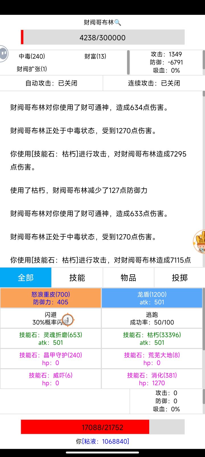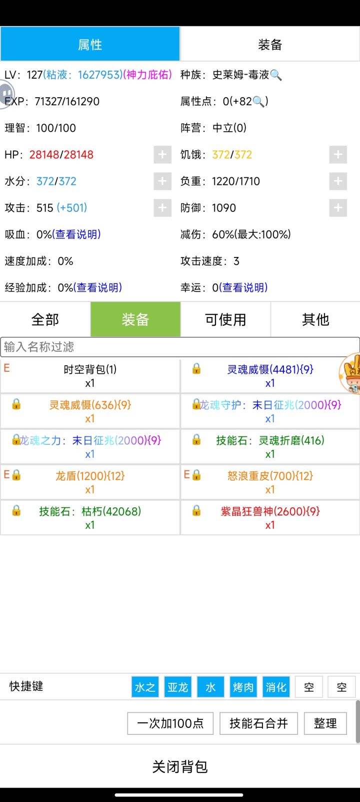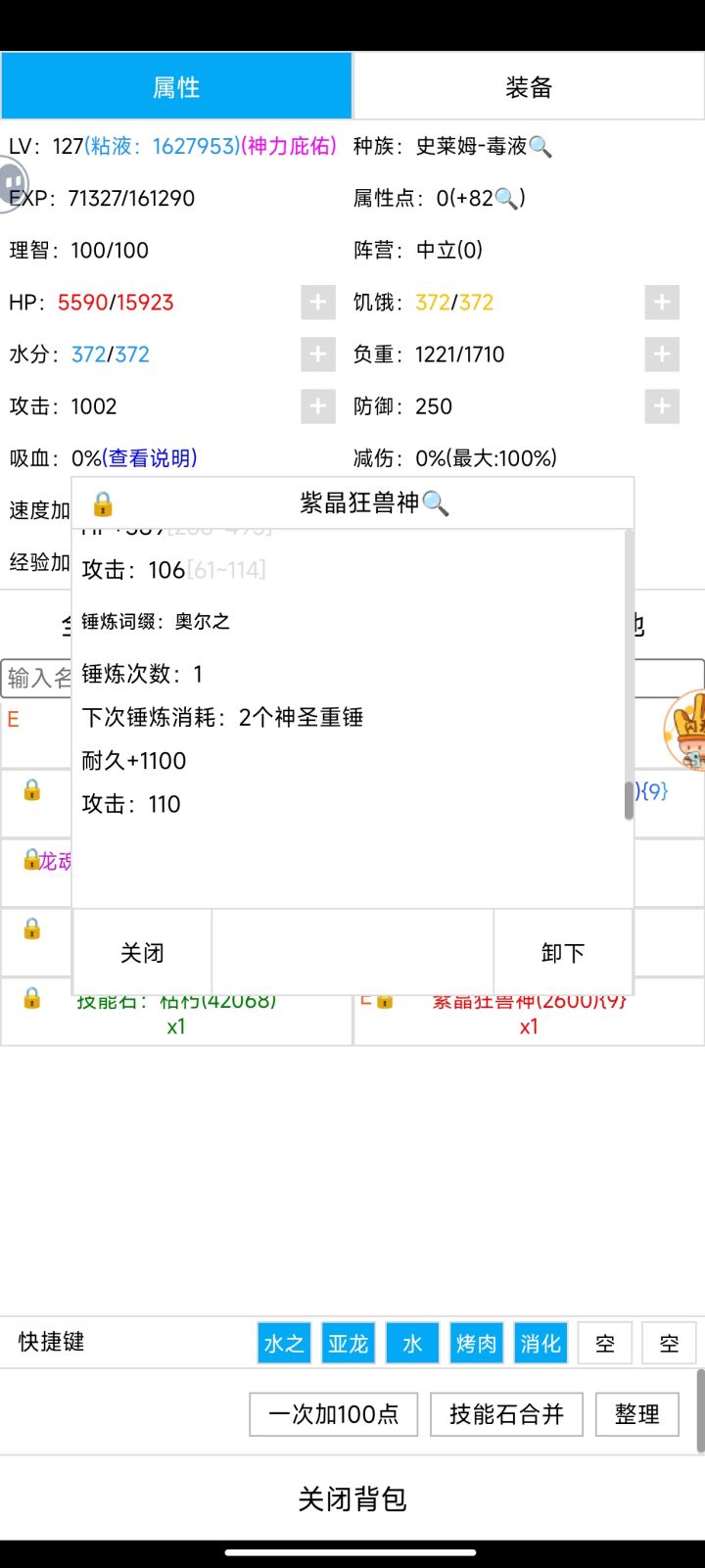 9孔紫晶狂兽神 锻造攻击力177,附魔猎豹106,锤炼神话110,等级254,神话之力82,龙魂宝石270,初始3点,一共1002点12孔龙盾+12孔怒浪重皮,攻1016 防1090水之神 消耗粘液30万左右,神性药剂 100瓶,粘液护甲1000个,枯朽15000个。开局晶甲守护,龙魂之力,巨龙之力,生死转换,开始粘液护甲叠甲,叠到10500,开石甲术,防御12000以上,水之女神不破防,再枯