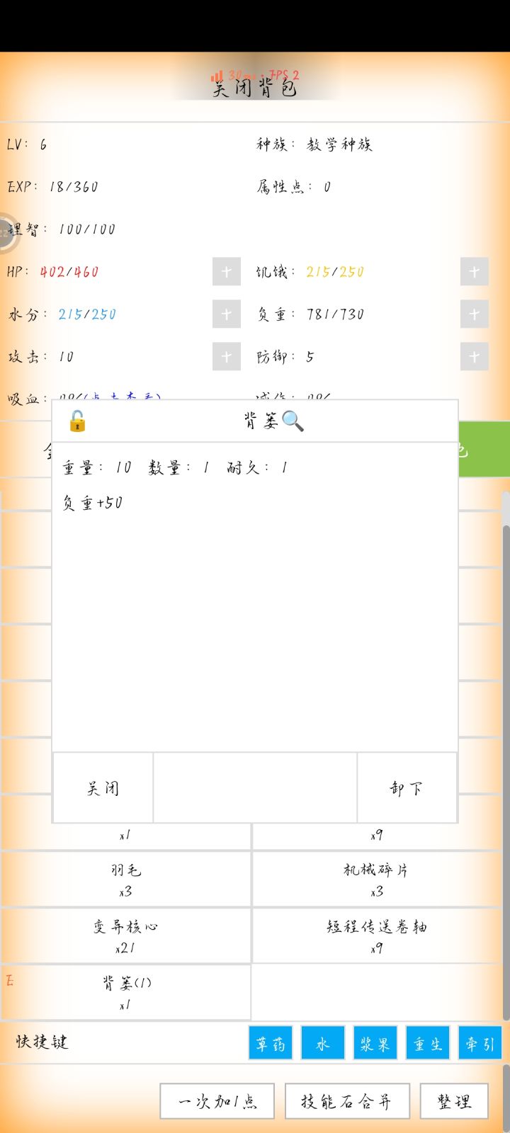 仓库页面点了“装备”或者“使用”之后无法取消,看不到自己的其他材料,只能一次性取出来再慢慢放回去,不知道是我的操作失误还是说是作者忘记处理这个问题了……建议这个交互问题优化一下……