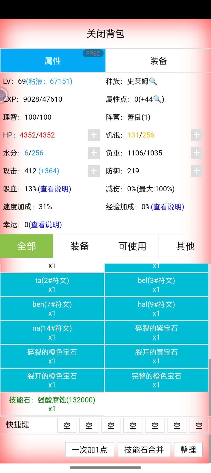 萌新史莱姆,简单难度一周目快半个月了才勉强60级。看其他帖子永恒宝珠好像有手就行?概率不是很低的么?我一个都打不出来.......(没有专门去刷)粘液值经常用完,然后回不了血被打死(目前比较苟死了三次),粘液位面效率也蛮低感觉。神性史莱姆会好一点吗?60级也就敢打打前三层的世界BOSS吧(卑微),靠卷轴慢慢磨......想换个时光沙砾回一级,想着有属性点重来应该会简单点吧,然后500界力。啊
