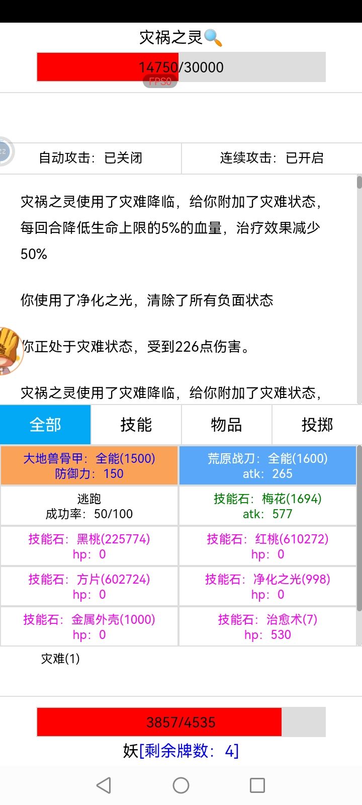 技能描述是半血以下使用,且只能使用一次,实际是半血以下这个技能直接替换了普通攻击,而且技能描述说灾难状态不会自动消失,实际每回合减少一层(应该是把“灾难状态”不会自动消失弄成了“使用灾难降临状态”不会自动消失)