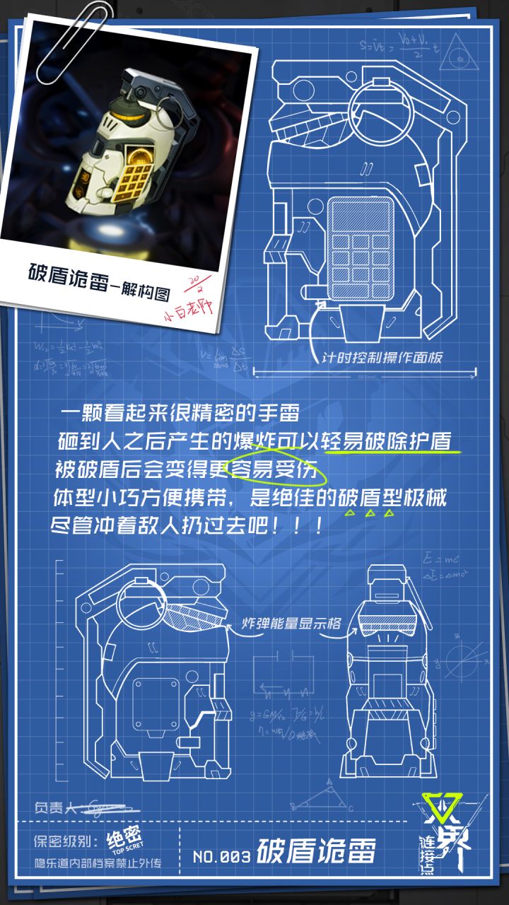 这一期同样也是破盾类极械,不过与只能攻击单一目标的破盾燃锯相比,破 盾 诡 雷可同时击破多个目标的护盾,建议首先搭配控制类极械聚拢目标,迅速使目标同时进入破甲状态,最后一波终结技清场!(本期主演:穆神好)以后小白老师会提高介绍极械的频率,记得按时上课哦——下课!