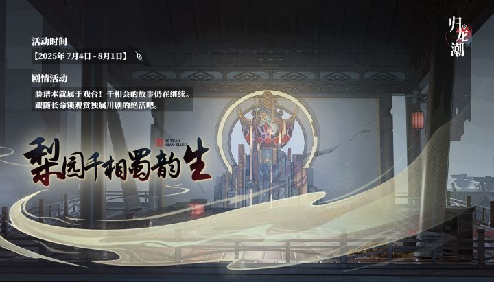 ▶ 下载《归龙潮》脸谱本就属于戏台!千相会的故事仍在继续。跟随长命锁观赏独属川剧的绝活吧。※ 活动时间:2025/07/04 10:00 ~ 2025/08/01 4:00※ 参与条件:完成正传任务「长夜将明」✦活动规则活动期间,导演完成梨园千相·川韵新生系列任务,可解锁戏班成员及对应的技法特训关卡。戏班成员解锁后,导演可前往戏台关卡技法表演。技法特训分为2个难度,通关后可获得通关奖