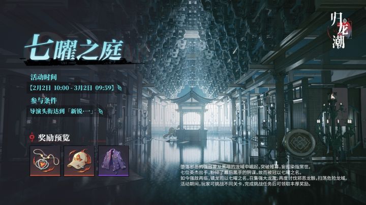 ▶ 下载《归龙潮》堕落邪恶的强敌曾从黑暗的龙域中崛起,突破帷幕,妄图染指常世。七位英杰出手,粉碎了幕后黑手的阴谋,故而被冠以七曜之名。如今强敌再临,镇龙司以七曜之名,召集强大龙胤,再度讨伐邪恶龙骸,扫荡危险龙域。活动期间,玩家可挑战不同关卡,完成挑战任务后可领取丰厚奖励。✦活动时间2025/02/02 10:00 ~ 03/02 09:59✦参与条件:导演头衔达到「新锐·一」➤《归