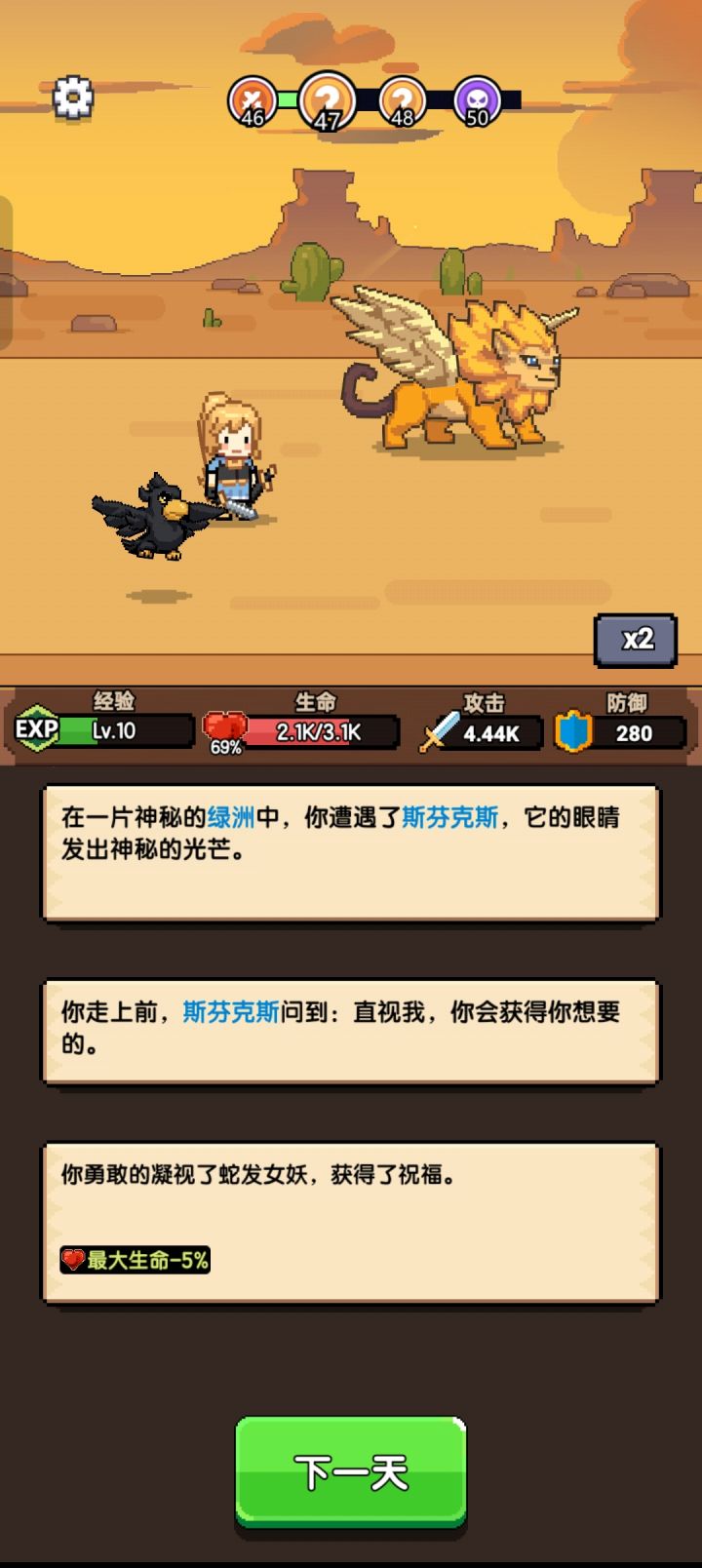 bug:换地图了遇见冰龙应该是冰龙蛋吧,如果属性不一样会更有意思,一样也无妨,起码图片和名字改改吧。遇见斯芬克斯也还是凝视蛇发女妖,不太对吧。虽然只是小问题,效果是一样的,但是这种小细节会让换汤不换药的感觉更明显了,代入感会差很多。建议:本来这种遭遇事件的玩法事件就是游戏的一部分,如果太粗糙游玩的感觉就会差一点。能让玩家代入是自己去遭遇事件其实才玩的有感觉。建议不同的地图可以多几个特色