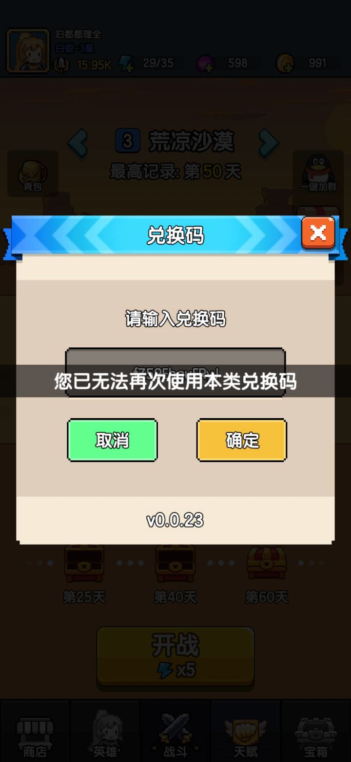 1、签到,第一天2000金币没有看见兑换码,第二是到第三天的兑换码使用不了,说无法再次使用该类型2、每次在沙漠遇见死掉的人说25%概率探索失败,结果都是探索失败碰见蛇