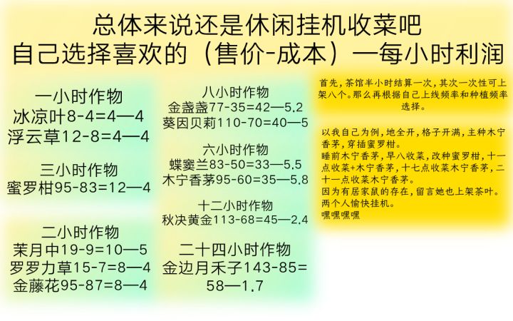 关于打工鼠种茶😸已经躺平了,有想过再细化一下,但是删档欸,删档欸,删档欸,那就愉快躺平啦希望能抛砖引玉,正式版上线的时候有大佬做一下三小时频率上线以及其他频率上线,作物怎么轮班,(玩过方舟搓玉的应该都懂哈哈哈。)