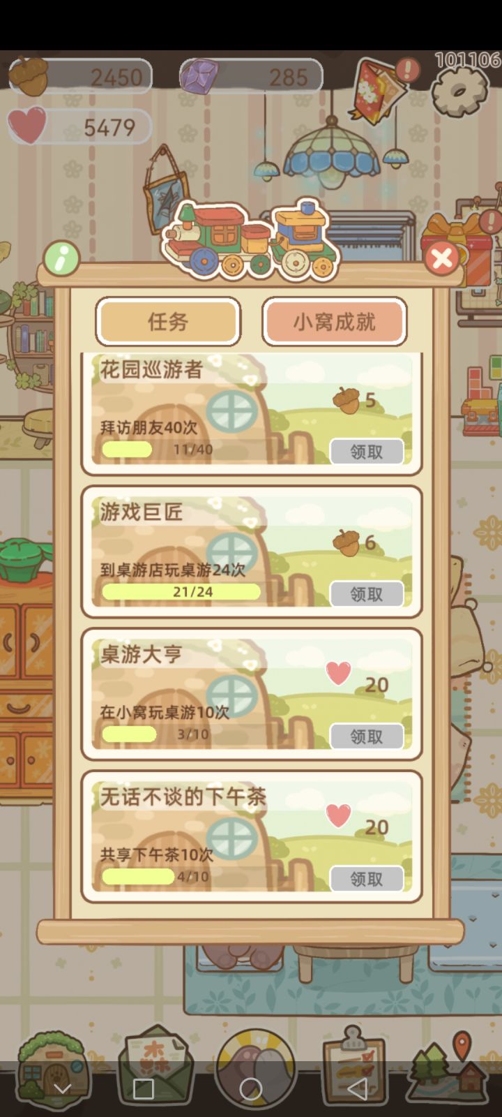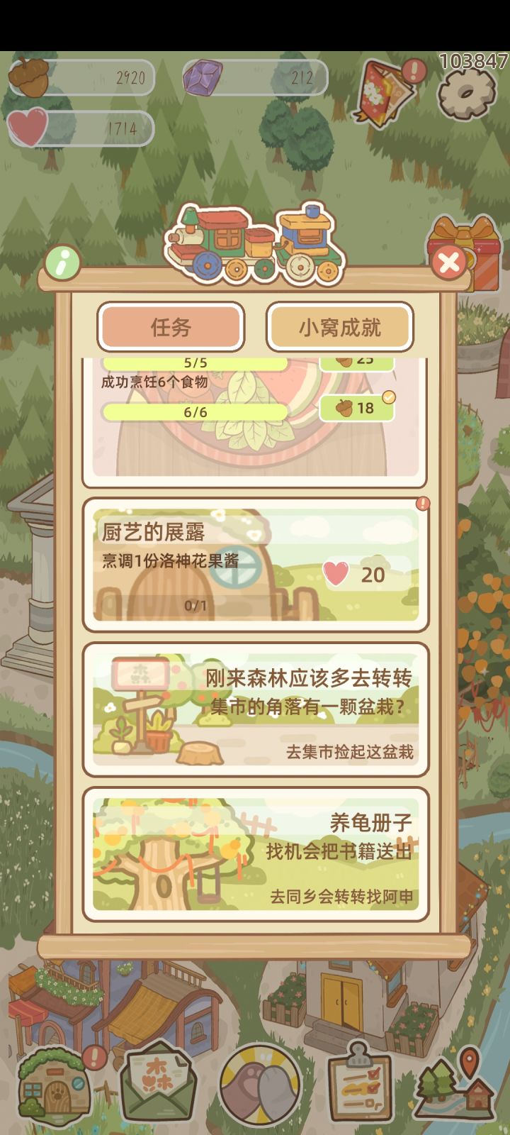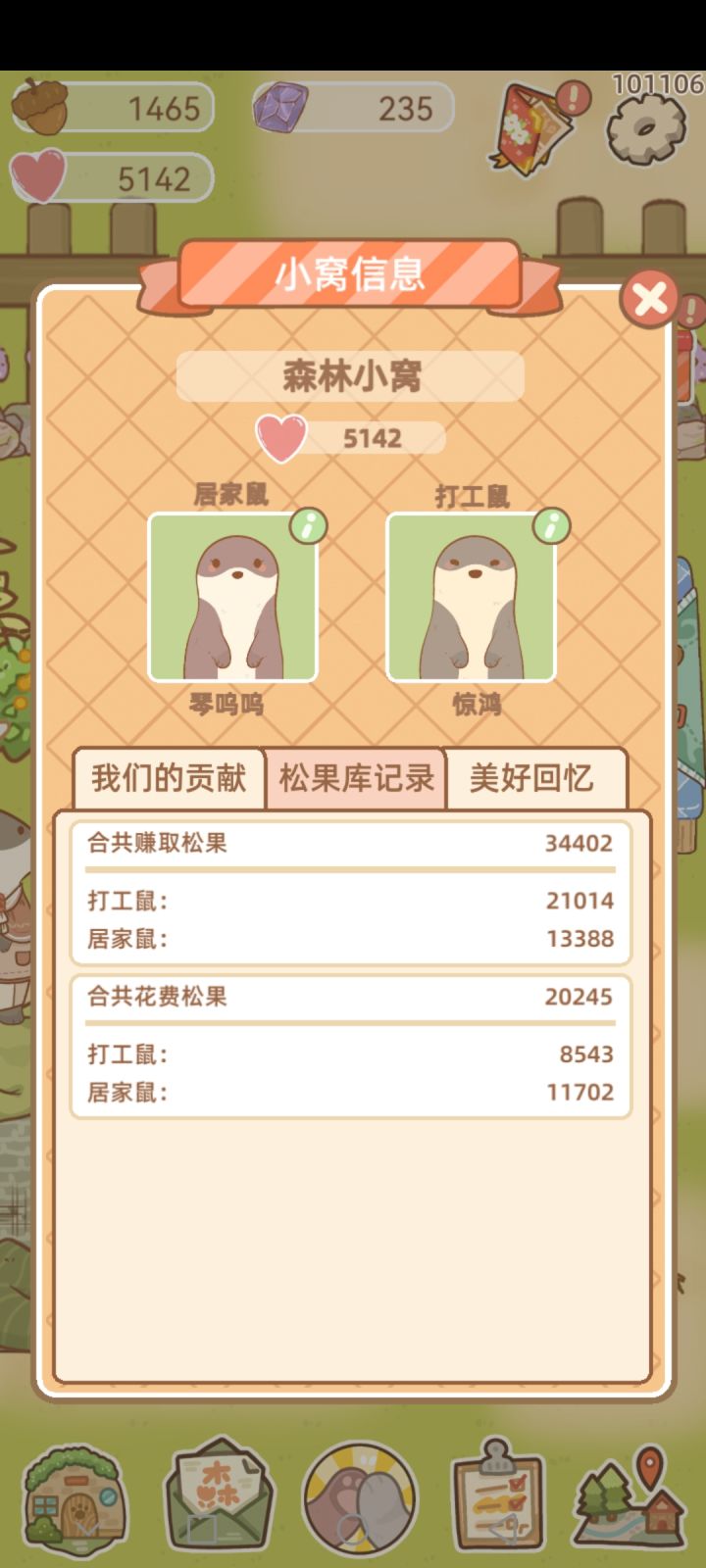 游戏整体很不错,就是有两三个问题。第一点,在搭档租窝之前没有特别说明租窝后打工鼠和居家鼠的分工是怎样。我根据任务方向和好奇心很快就找了搭档,租窝分工时都还不知道打工和居家的情况,没有相关说明。搭档选择了居家我就顺势选择了打工,后来游玩过程中才发现自己对居家方面的活动更感兴趣,但是已经没法改了。第二点,很多东西不知道具体用处和来源。比如小窝成长值如何获得,个人信息里下边收藏框里的那些成就分别