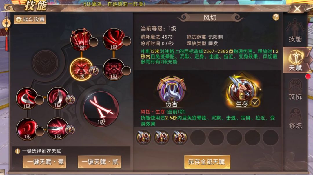 天赋觉醒 盛世重启快快快准备好你们的瓜子薯片肥宅水抢先进入今天的主题吧!职业天赋在50级后,玩家可解锁天赋系统,对当前职业的主动技能效果进行修正、或替换为全新技能。1系统开启2效果说明3操作说明下面将以战士、法师和天煞为对象,进行天赋效果的简单说明及演示:PS:下列技能描述均为内网状态,并非最终上线效果,请以新版本更新后的技能面板为主哦~天赋演示战士:新技能在周年庆版本中