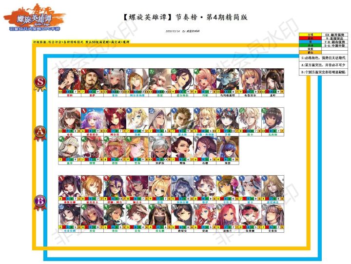 咕了几个月,等新养成的鸽鸽 咕咕咕咕 没啥关系吧不废话,上图改动须知1.调整个别角色档位 如[ 凌格兰 ] [ 怒鬃 ] [ 蔻蔻 ]等,S排红色字体标红的为观察区,处于强度A-S之间,等新养成出来后再另行确定强度2.新增角色[ 秀拉 ][ 布鲁贝尔 ][ 连卡 ][ 雷夫林 ][ 爱莱诺尔 ][ 莉莉安娜 ][ 落星 ][ 海瑟 ][ 海伦娜 ][ 贝萨拉 ]3.节奏榜去除无法获取的角