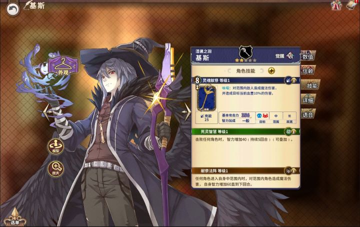 各位店主上午好呀~今天分享给大家的是一位SR稀有度的法师基斯。 SR 基斯(法师) 主线推荐度:★★☆☆☆排名战推荐度:★★★★★(召很多小怪在一起的Boss)PVP推荐度:★★★★☆ 奥义“灵魂献祭”可对范围内敌人造成目前血量10%的魔法伤害。技能“死灵智慧”让基斯在击败敌人时提升自身智力值(满级增加80,持续5回合,可叠加)。技能“献祭法阵”可对自身攻击范围内的任何人造成魔法伤