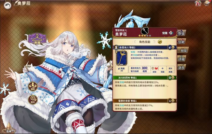 各位店主上午好呀~今天给各位店主分享一位SSR稀有度的冰属性法师奥萝菈。 SSR 奥萝菈(法师) 首抽推荐度★★★★★主线推荐度:★★★★☆排名战推荐度:★★★★★(Boss水抗低时)PVP推荐度:★★★☆☆ 奥义“永恒冰川”对范围内敌人造成魔法伤害,并冻结6时刻(满级时造成4000纯水伤害)。技能“冰川的回响”可增加受冻结的敌方受到的纯水伤害(满级时增加40%),使用奥义后所有