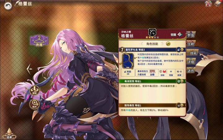 各位店主上午好呀~今天给各位店主分享一位SSR稀有度的毒属性射手格蕾丝。 SSR 格蕾丝(射手) 首抽推荐度★☆☆☆☆(新闻活动有送)主线推荐度:★☆☆☆☆排名战推荐度:★★★★★(Boss毒抗低时)PVP推荐度:★★★☆☆ 奥义“曼陀罗吐息”可对范围内目标造成物理伤害,并延长目标身上的中毒效果(满级时延长2回合);被击中目标释放毒烟,使范围内友方中毒(满级时3回合共1440毒素