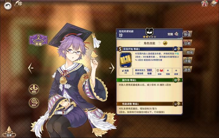 各位店主上午好呀~今天分享给大家的是一位SR稀有度的辅助珍。 SR 珍(辅助) 主线推荐度:★★★★☆排名战推荐度:★★★★★(适用于包含2至3位法师的队伍)PVP推荐度:★★★☆☆ 奥义“实验开始”可以对范围内敌人造成魔法伤害,并随机附加中毒(满级时中毒3回合造成1530毒素伤害)、受魔法伤害增加(满级时1回合内增加20%)或造成物理伤害(满级时1280物理伤害)效果。技能“副作