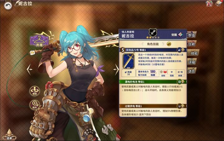 各位店主上午好呀~今天给大家分享一位SR稀有度的战士妮古拉。 SR 妮古拉(战士) 主线推荐度:★★★★★排名战推荐度:★★★★★(冻结Boss最佳坦克,断Boss咏唱)PVP推荐度:★★★★☆(配合雅丽娅先手施放奥义) 奥义“试验品72号”会丢出电球对范围内敌人造成魔法伤害,并触发触电效果。技能“漏电的电池”让玩家使用武器或奥义攻击触电的敌人时,减少敌人行动值(满级时减少3),并