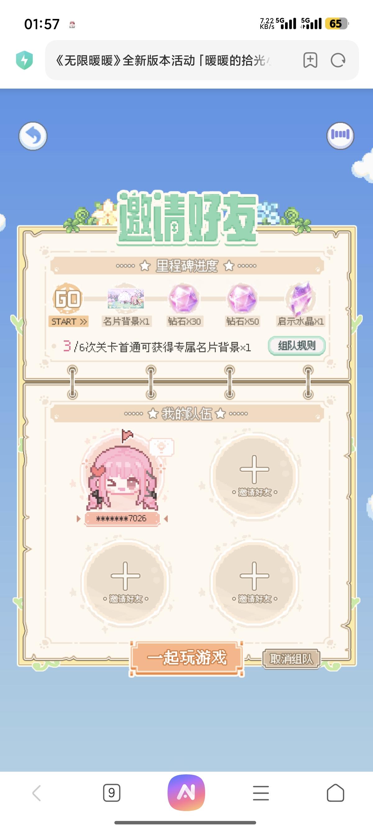回坑了 还有组队的吗?或者还缺一个人的也可以「暖暖的拾光小屋」活动开启!点击 https://infinitynikki.nuanpaper.com/proj/NikkiHome.html?qqgj=ySmISeJpcI 加入好友队伍;前往页面完成更多任务,可赢取钻石、启示水晶等多重游戏道具!还有机会赢iPad/PS5/游戏手柄/精美周边等好礼!#无限暖暖