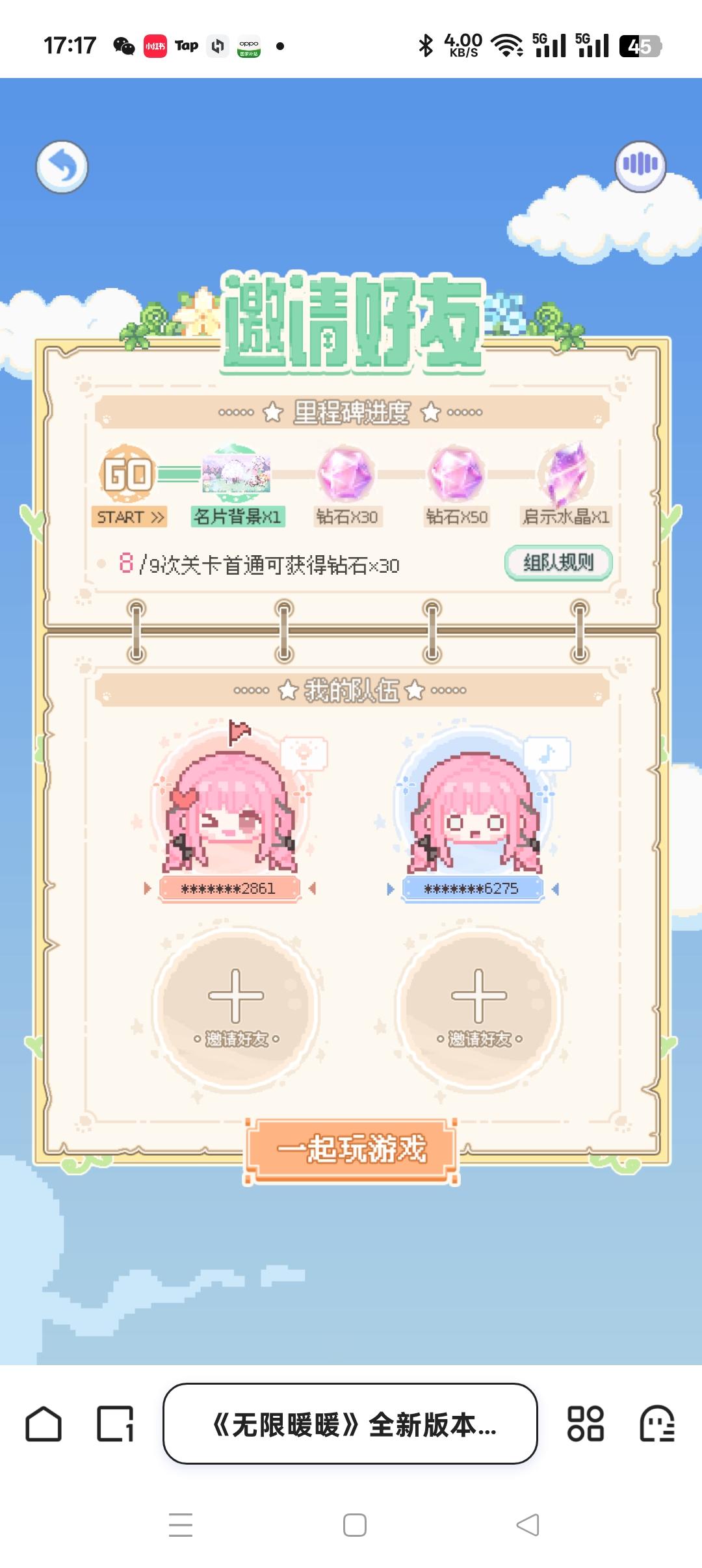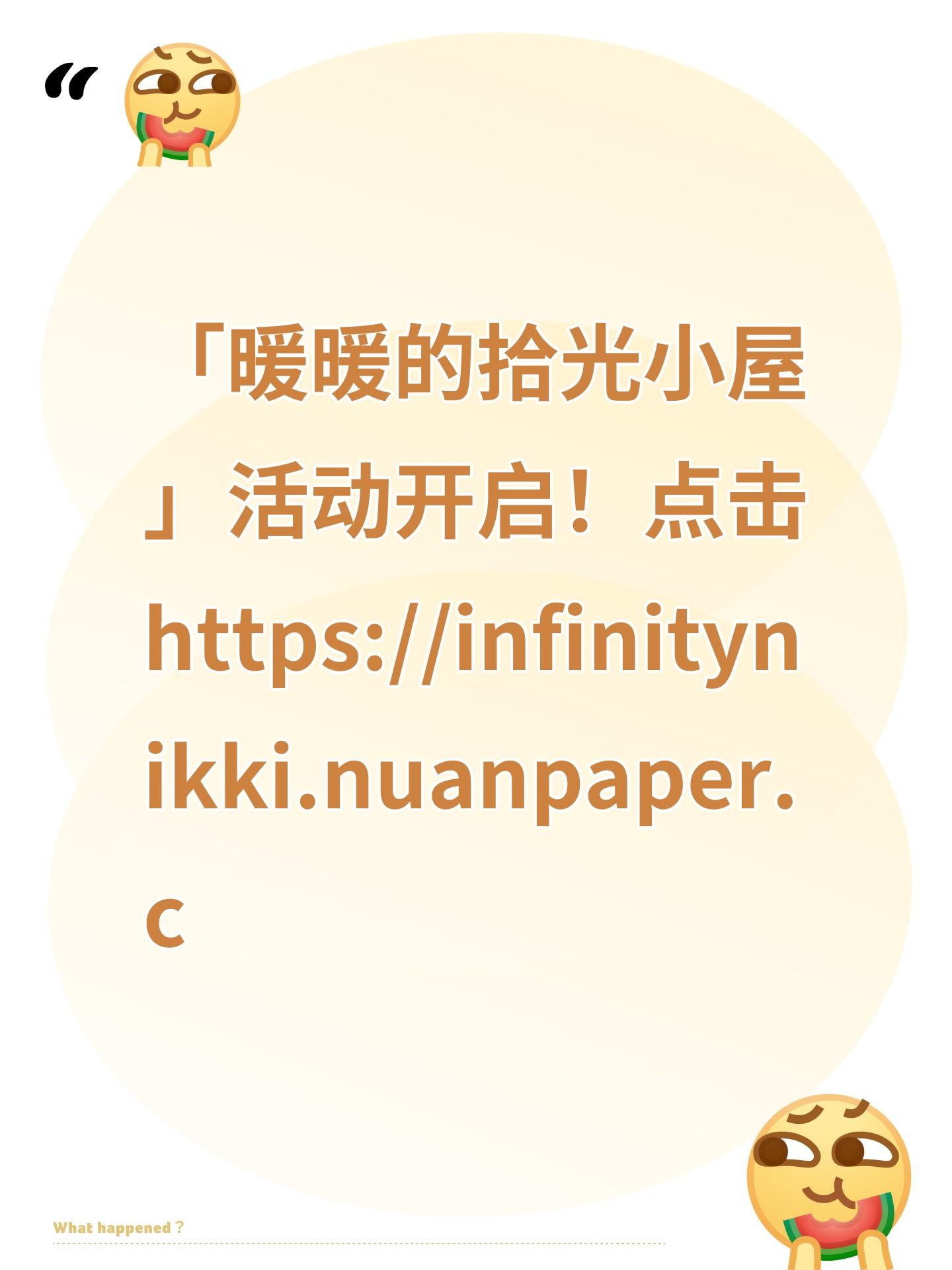「暖暖的拾光小屋」活动开启!点击 https://infinitynikki.nuanpaper.com/proj/NikkiHome.html?qqgj=WKSHZhwhsm 加入好友队伍;前往页面完成更多任务,可赢取钻石、启示水晶等多重游戏道具!还有机会赢iPad/PS5/游戏手柄/精美周边等好礼!差一个人