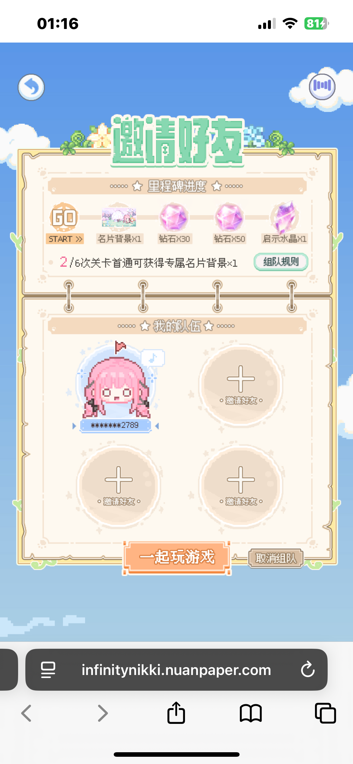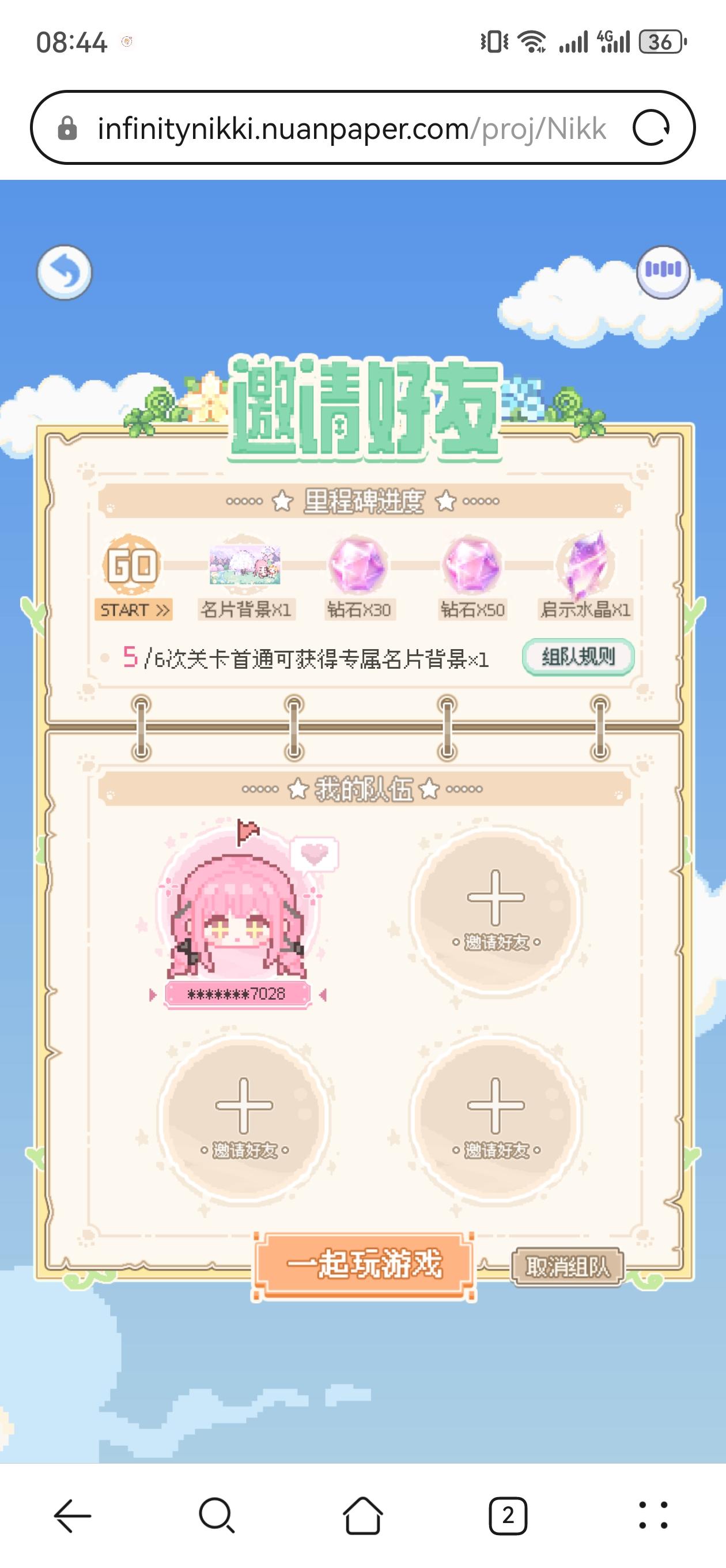 「暖暖的拾光小屋」活动开启!点击 https://infinitynikki.nuanpaper.com/proj/NikkiHome.html?qqgj=hYG2wguWOx 加入好友队伍;前往页面完成更多任务,可赢取钻石、启示水晶等多重游戏道具!还有机会赢iPad/PS5/游戏手柄/精美周边等好礼!