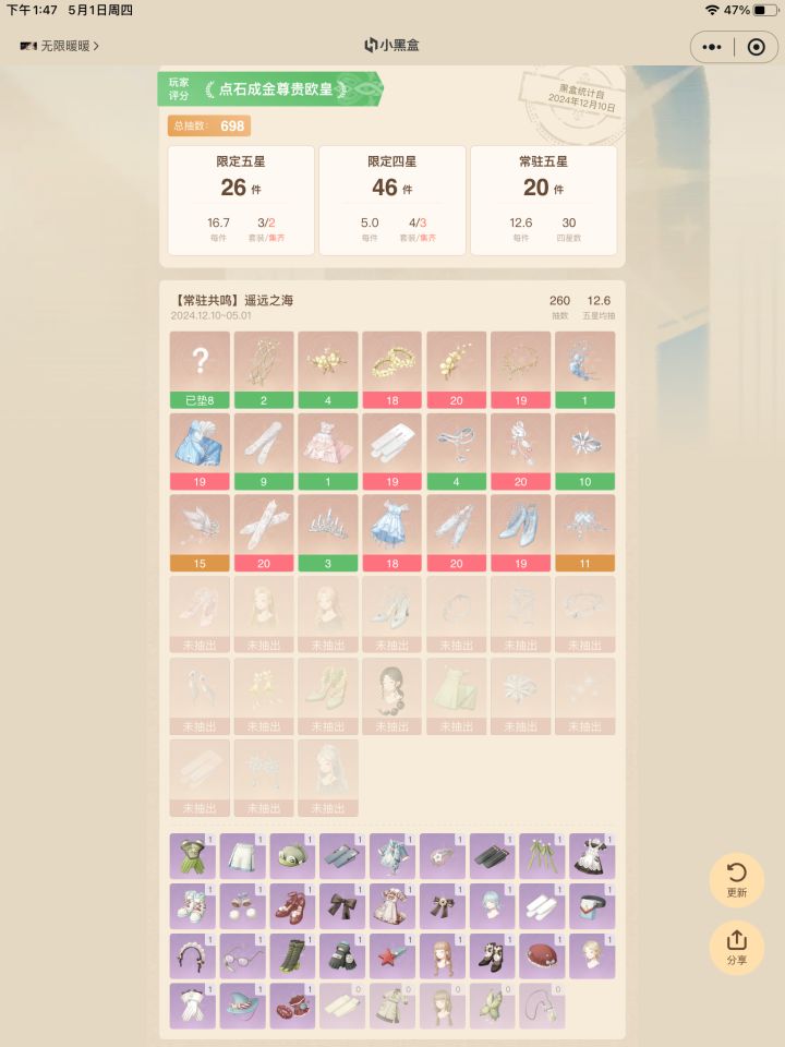 上午把邮件送的抽了 没想到20抽3件上小黑盒一看 12.6我回来了!!也是从薛定谔的欧州人(5抽一件的梦露,186气球和均13、14常驻阁 中和)变成初出茅庐的欧皇(162齐鸟后)再变成点石成金尊贵欧皇(更新完常驻阁数据后)嘿嘿现在想看看有没有绝世欧皇 让我涨涨见识 一下能接受贴脸晒欧了#无限暖暖 #无限暖暖抽阁 #在全世界遇见无限暖暖 #贴脸晒欧致歉 #无限