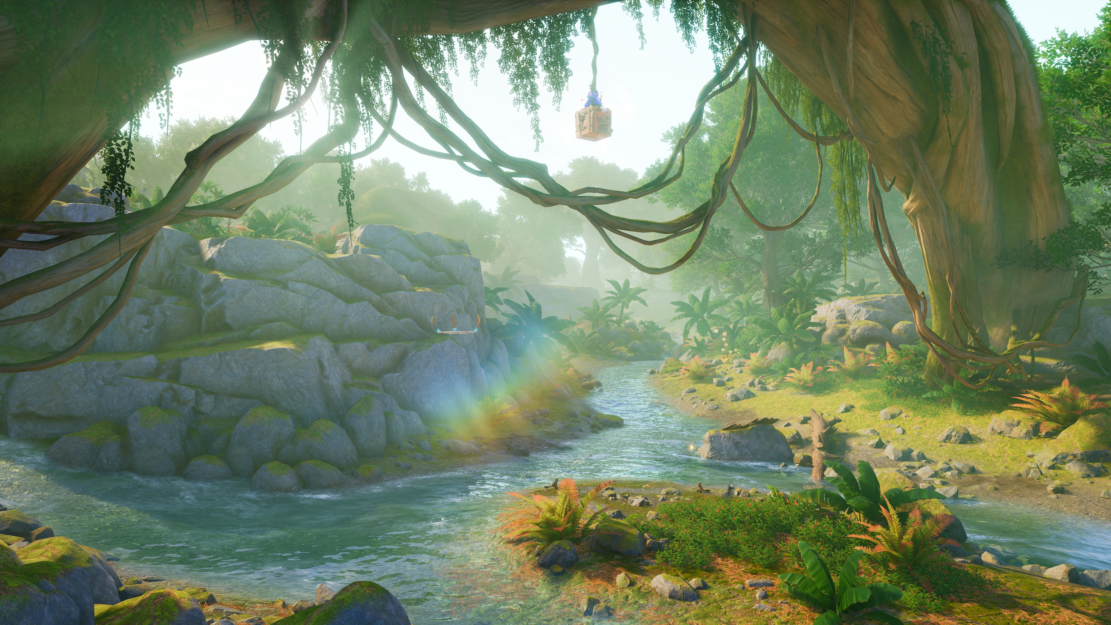 去河对岸的蹦床上,从蹦床跳到最高点时悬浮,用弓打箱子上面的爆爆花让箱子落地