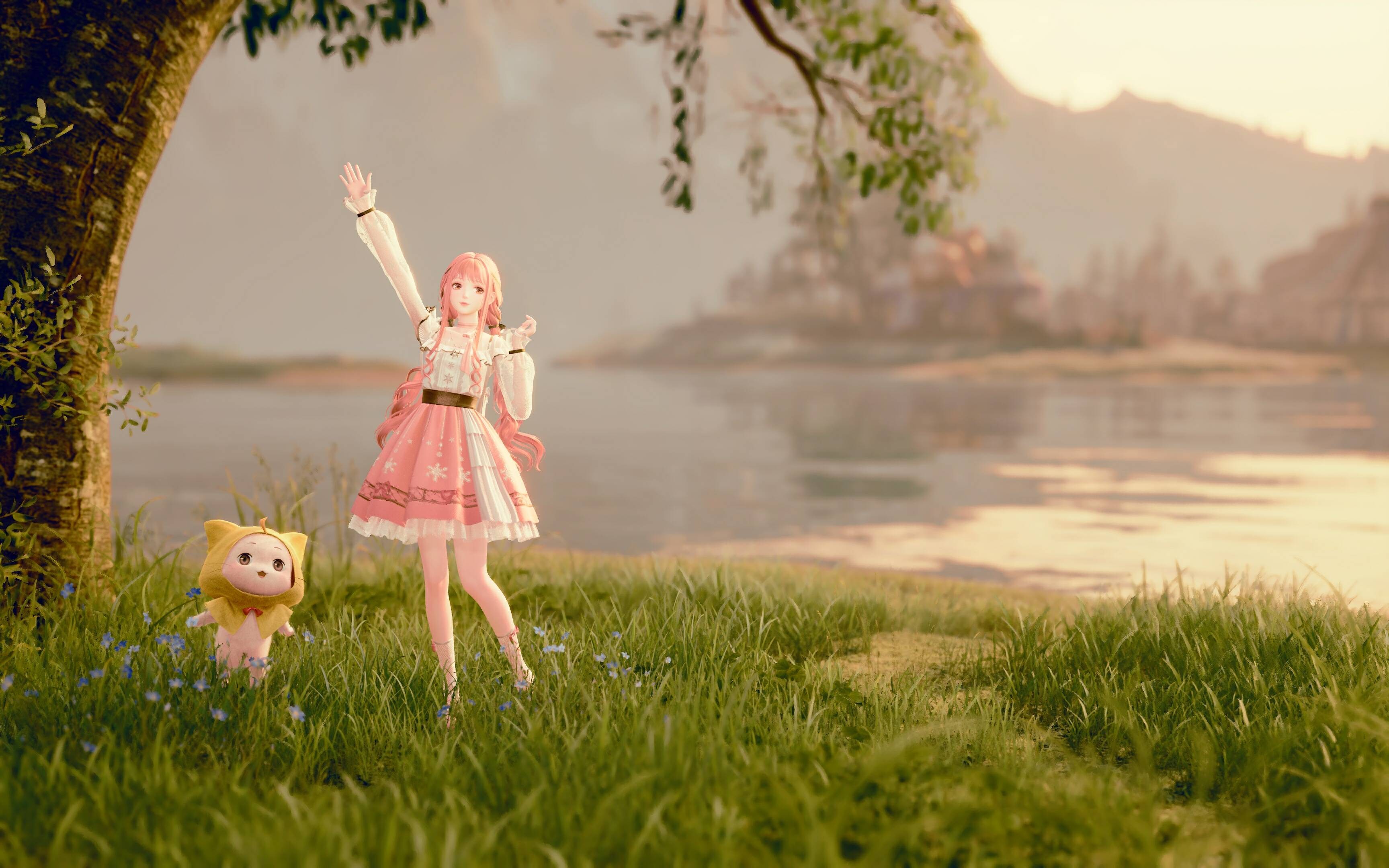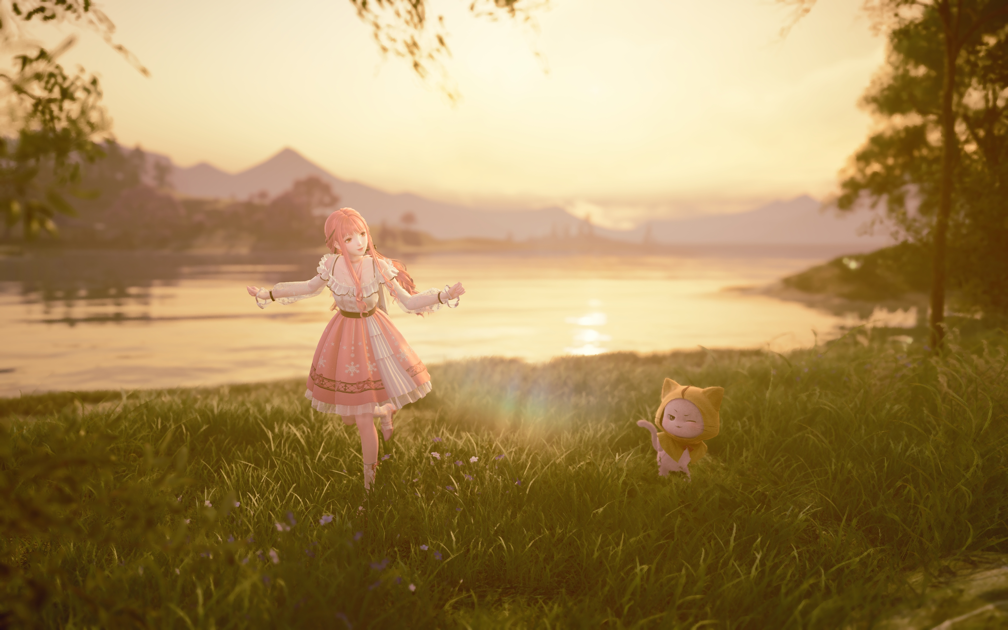 时间为早上5-6点,视角转一转可以有彩虹光晕非常唯美!落日,暖暖和大喵!