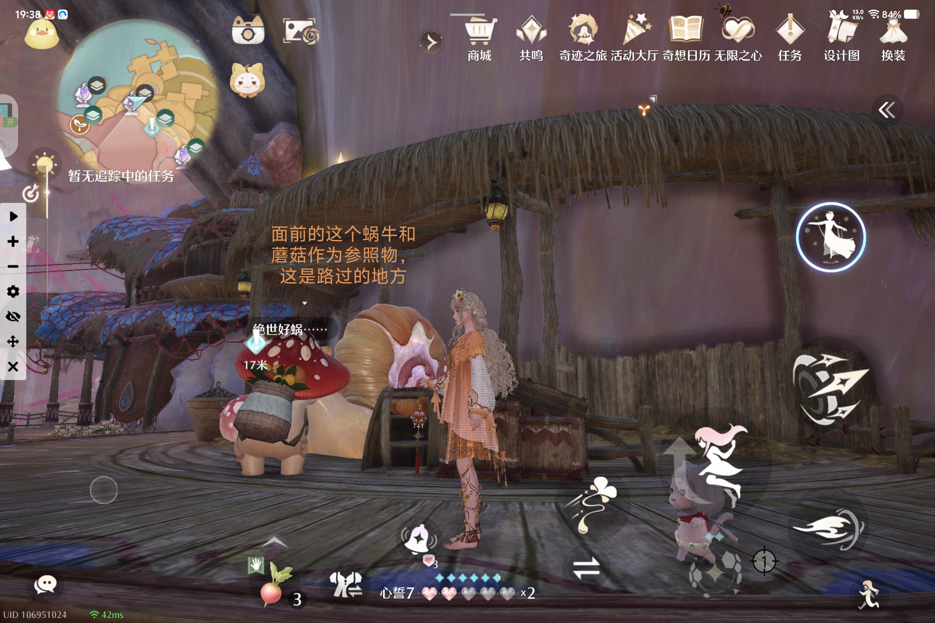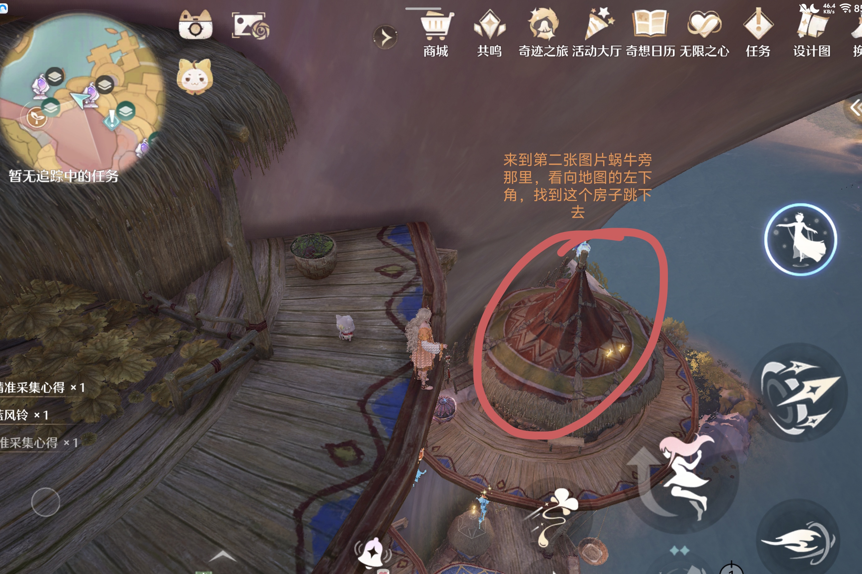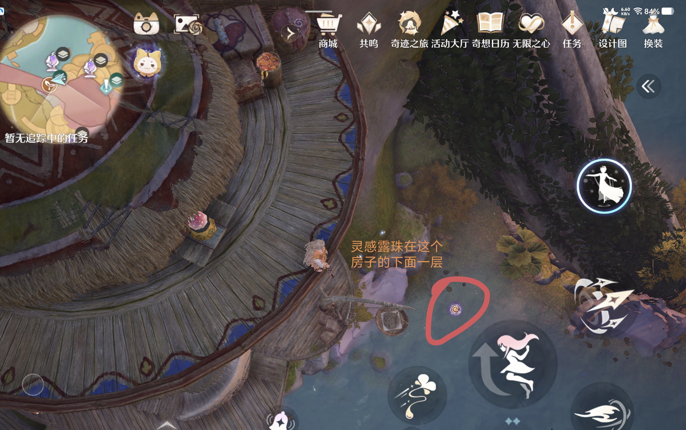 来到攻略标记点位置,房子后面有两颗灵感露珠,然后再跳上面前的房子,视角按地图的右边转,空中飘着三颗灵感露珠