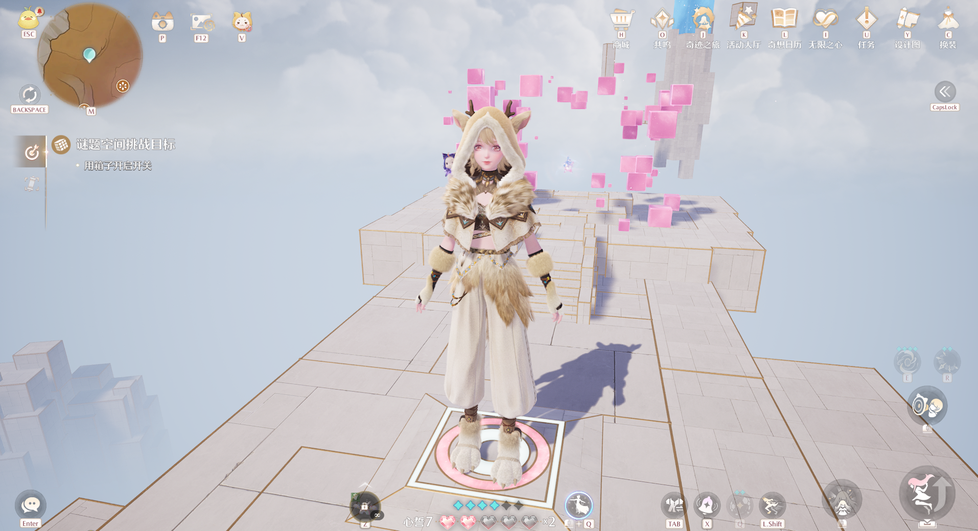 跳到有箱子的升降平台上,变大将平台压到最低,跳上来把另一个箱子推到平台上,然后变小 暖暖+2箱子的重量刚好可以跟红色升降台齐平,先推一个箱子过去,然后在平台升太高前把另一个也推过去 如果没来得及推第二个,就让暖暖变大把平台压下去重新尝试 两个箱子都到红色升降台后,启动低处的升降台机关让平台升上去,再把箱子推到终点即可