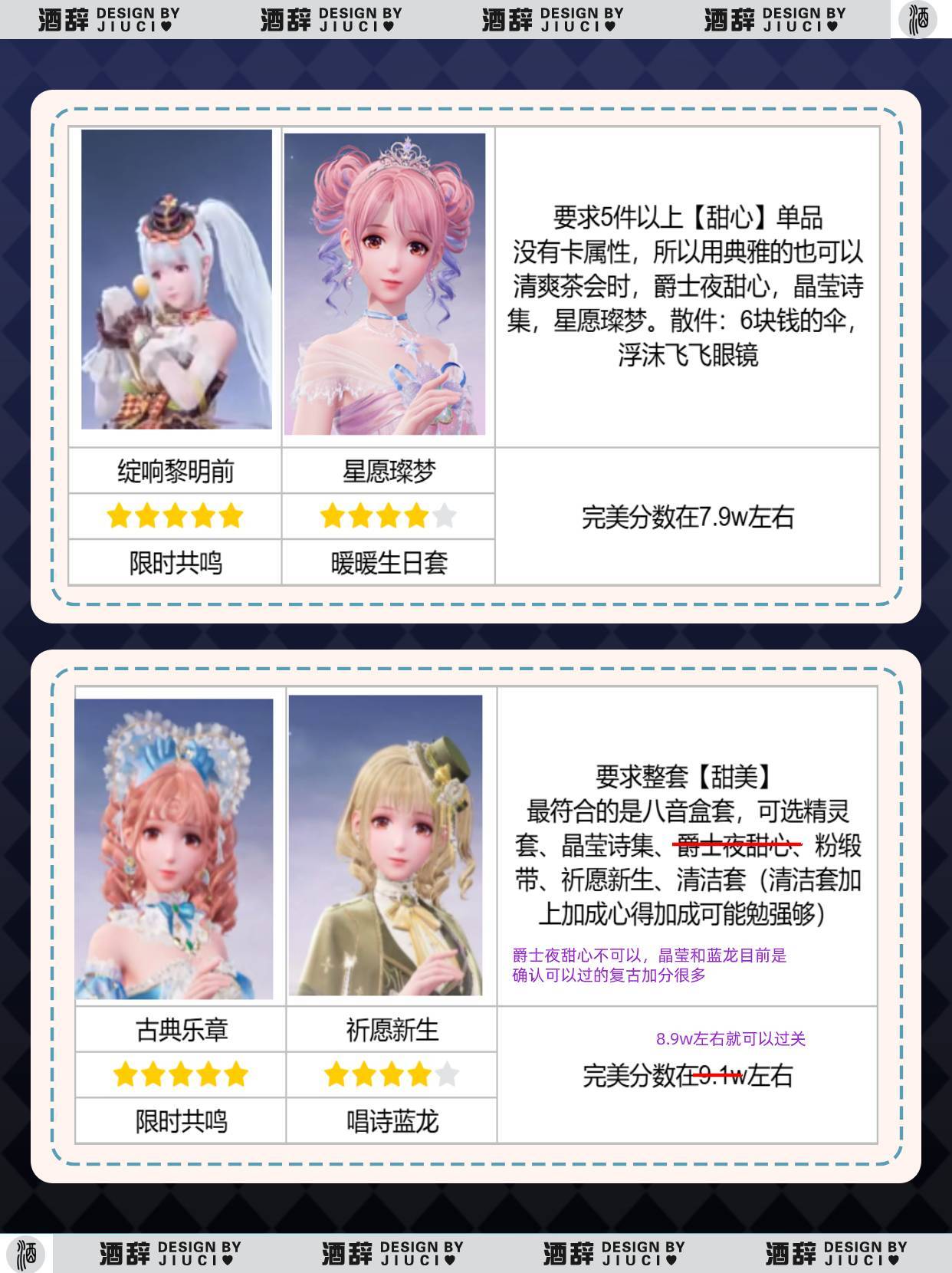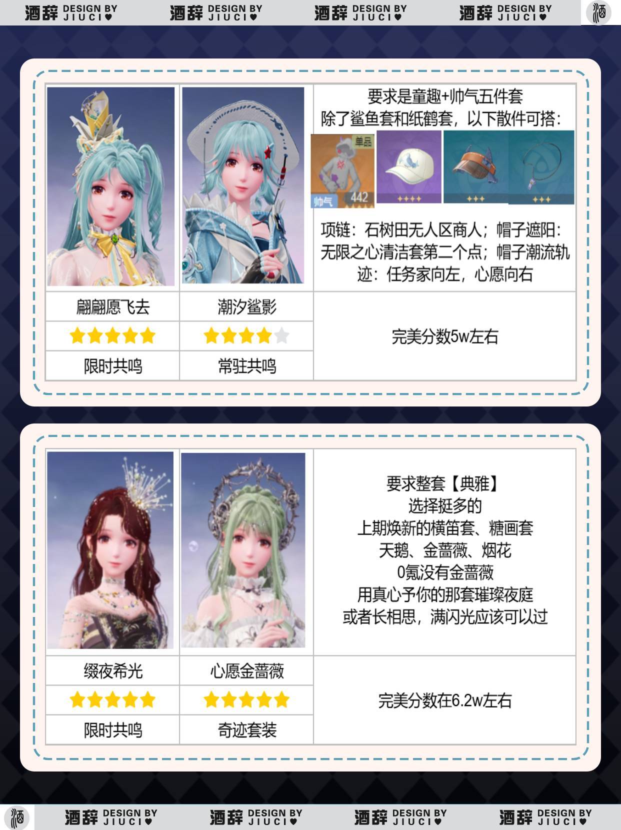 先说结论,不抽卡最多23星,抽卡24星最少抽2件【帅气】【童趣】(翩翩愿飞去,潮汐鲨影)。 推荐:故乡的风套,祈愿新生套,无限之心清新+100和甜美+100。可选:咏叹银夜莺套,无限之心全部点满这期卡的是第5关,其他的反倒是不难。第8关完美分数89000,无抽3星。推荐配置祈愿新生套为基底,换:随意饰品2个。全部10级,8成焕新。祝福闪光:曦晖头手脚。第7关完美分数79000,无抽3星
