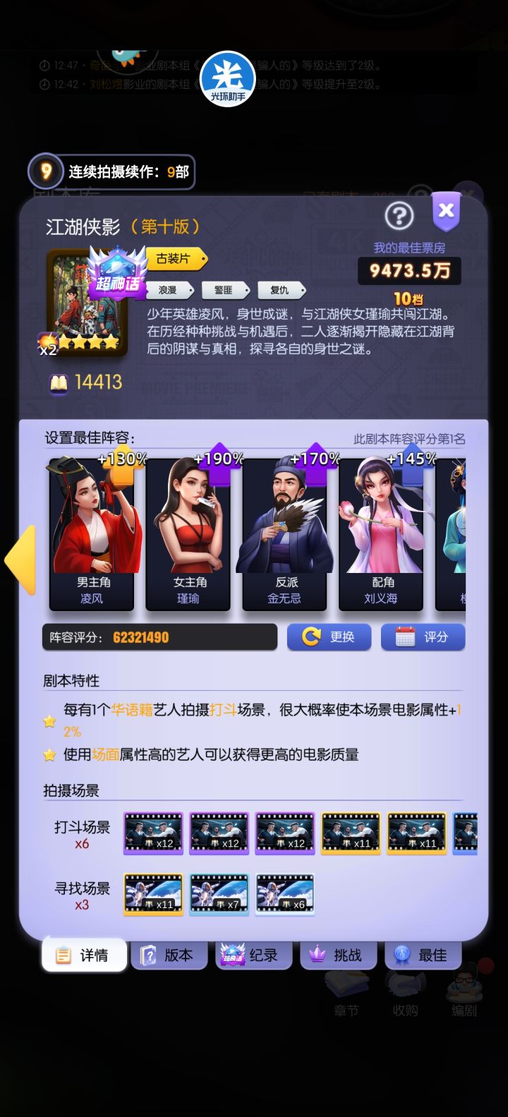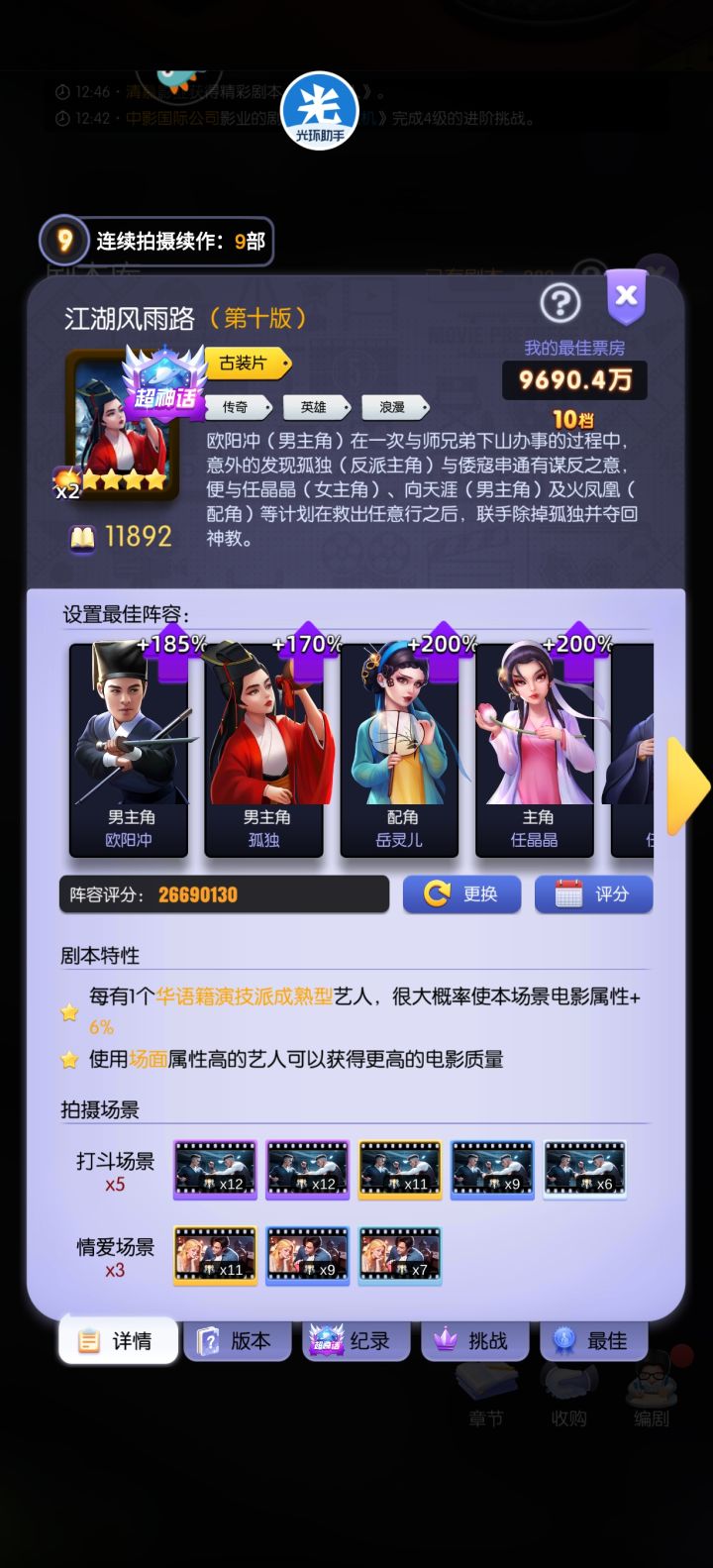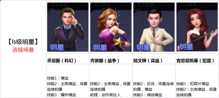【LS级明星】【SSS级明星】拉人系列【SSS级明星】增益系列【SS级明星】【S级明星】【欧非级明星】【1】书接上回,因为连续的相同场景的加成是目前收益最高的,所以推荐培养的ls级明星都是技能中有能改变场景的能力例如:拍摄战争片时,第一个是战争场景,我这个改场明星登场,技能触发后,下一个就也还是战争场景,如果能连续达到11个战争场景,这部片几乎就是高评分第2种就是强行变场景,需要结