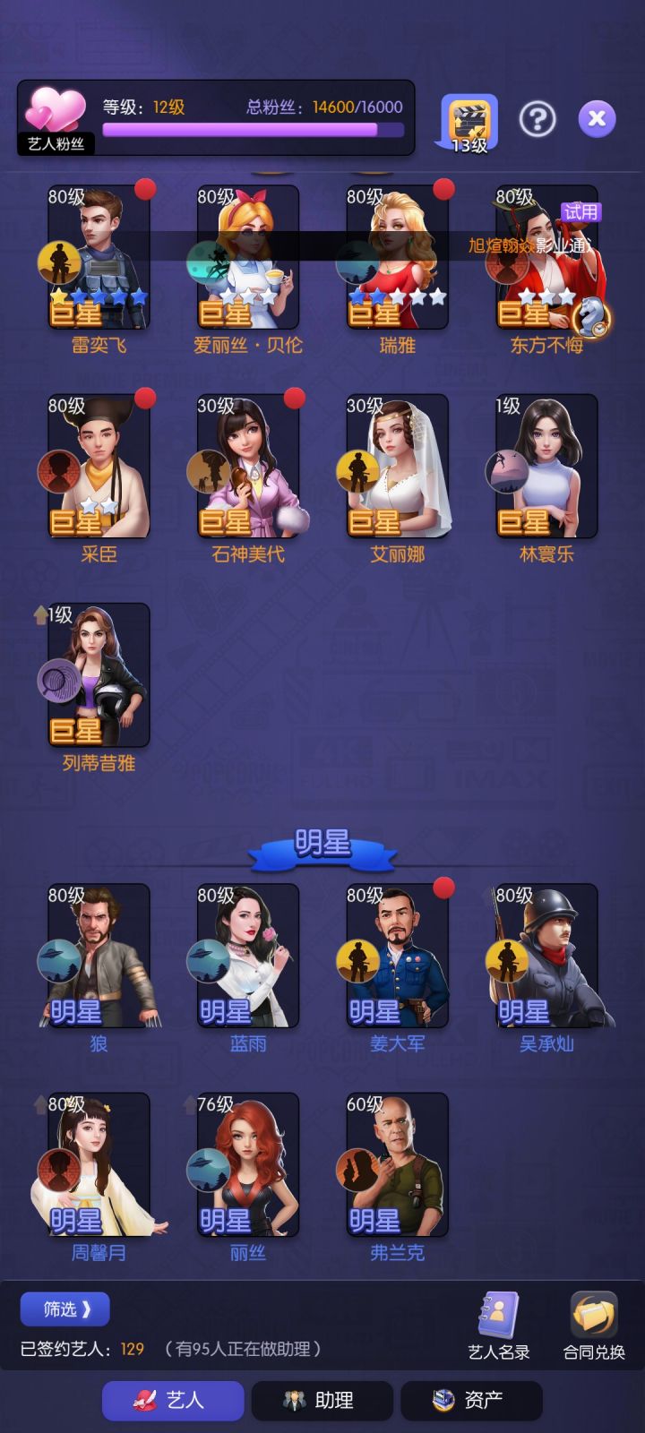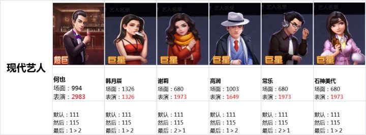 专属第一个先做冒险艺人丹尼尔,这样打斗场景也可触发旅途。第二个小白,优先红也是小白。其次小青,顾长歌,东方。诸葛出来第一时间搞到,提升非常大,可以让传奇非常稳定,没他之前全靠脸,有了之后拍古装神本传奇概率大大提高。拉人用现代艺人,因为她是华语系艺人而且比雷好用的多。古装有两神本,一个笑傲江湖,一个黑卡本。黑卡本非常强,看阵容评分就知道。这游戏基本没花钱,全靠喜爱,玩到毕业。从票房大卖王玩到影业梦想
