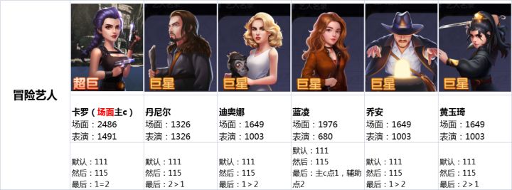 T3:何也(纵横四海,哥哥),风华绝代一如既往。 1技能,拍摄约会或者打斗场景的时候,80%概率+自身表演属性,有剧组中其他擅长现代的艺人数量决定(注意:是剧组中,不出演都能生效,所以这个技能稳定性就很高了,缺点也是很明显的,接下去会说)每多一名现代艺人+5级是225%表演属性 2技能,拍爱情类,有80概率使随机2名华语女加双属性,拍成叙事则加2名华语男 5级是300%好了我开始分析:1技能
