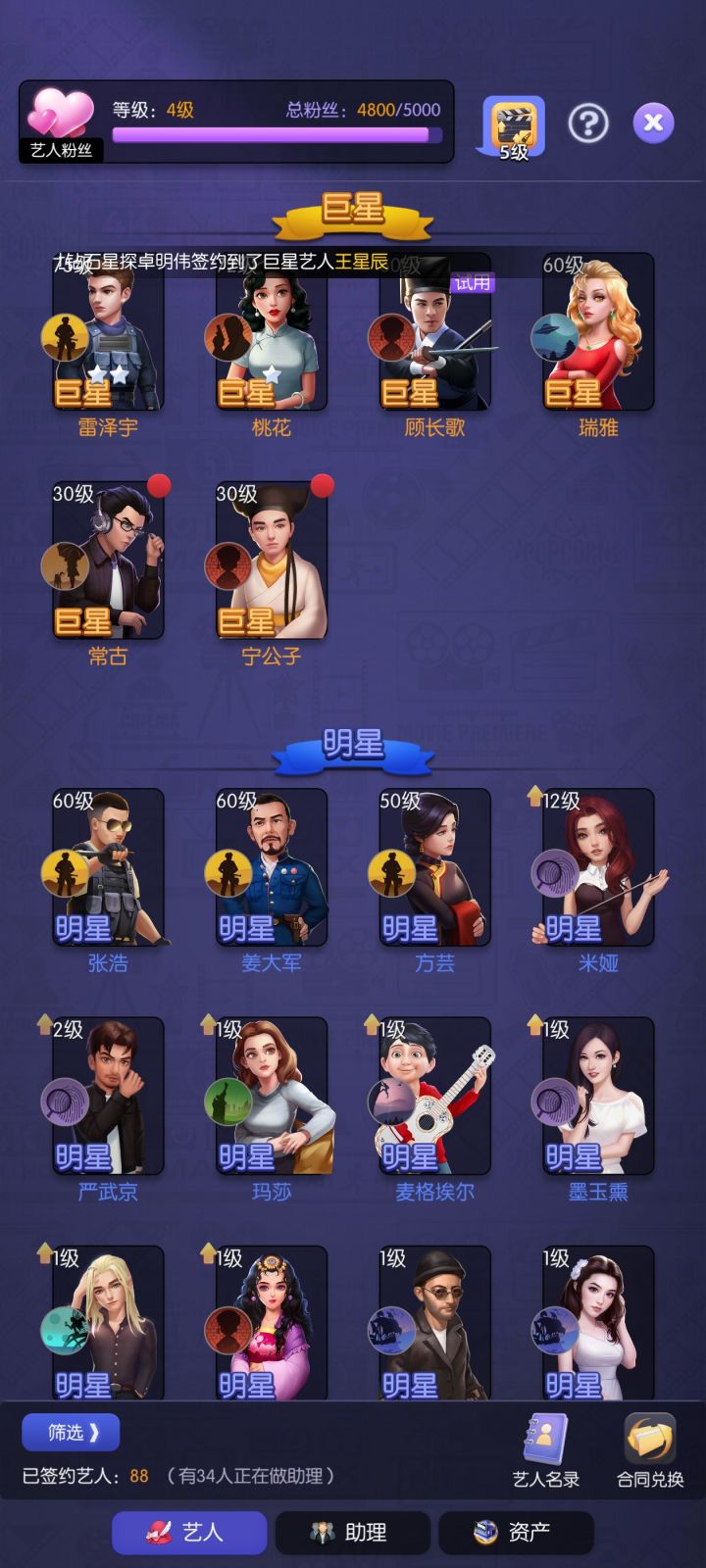 第一:开局双巨星新号进游戏之后,钻石星探的抽卡次数满三十次会有一个保底巨星,在抽满二十九次的时候暂停,这个时候转去抽限定星探,必定会出一个巨星,然后再回去钻石星探那里抽第三十次出保底巨星,这样就能有双巨星开局了。ps:这种方法,必须要是新号没有巨星,并且 29 抽也没有出巨星的情况下才能有效,另外抽限定星探出巨星的次数,基本上是在十次以内会出,也有十三次,十四次这种情况。第二:明星艺人助理成