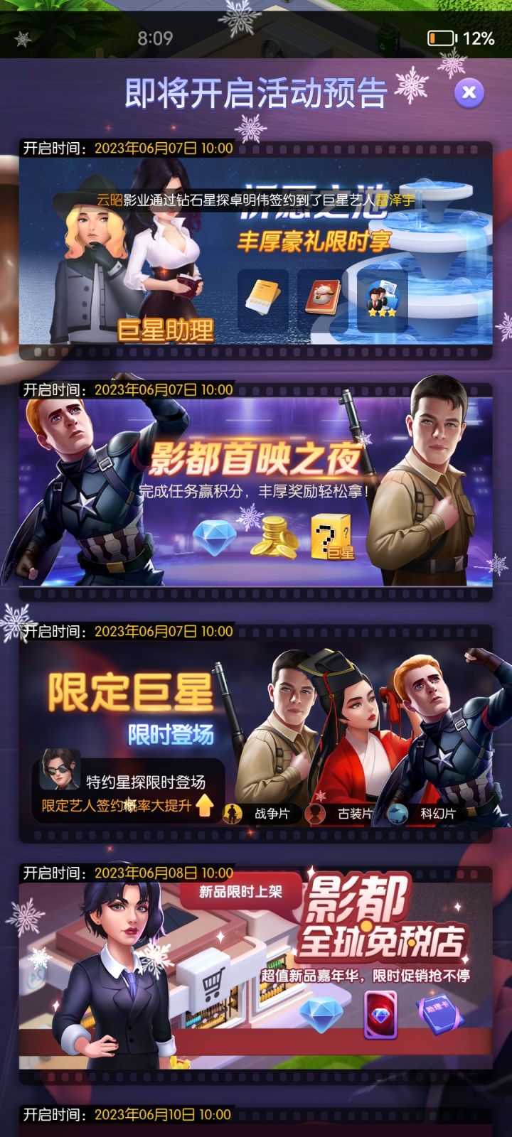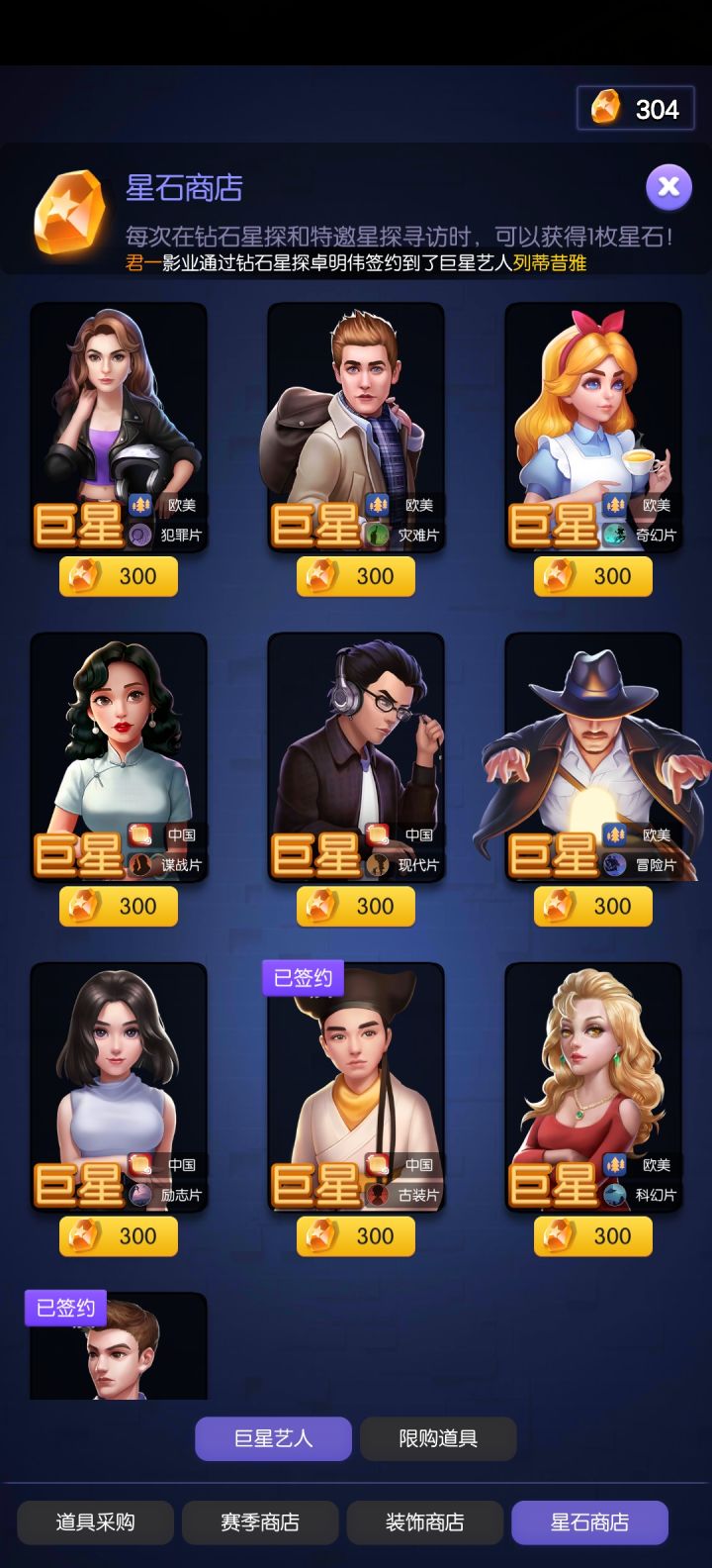 值班经理目前版本可选经理有11位,每个经理都有不同的词条,其中9位经理是给予某类型艺人增加场面或者表演属性,另外两位存在较为特殊。张可可:有XX型艺人出演的电影,所有艺人拍摄时提升25%的表演属性刘景浩:有X性艺人出演的电影,所有艺人拍摄时提升25%的场面属性丁爱玲:XX型艺人出演所有场景的概率提升35%罗柯景:剧本星级提升XX派艺人拍摄电影时的场面属性,每颗星提升15%钟欣怡:剧本星
