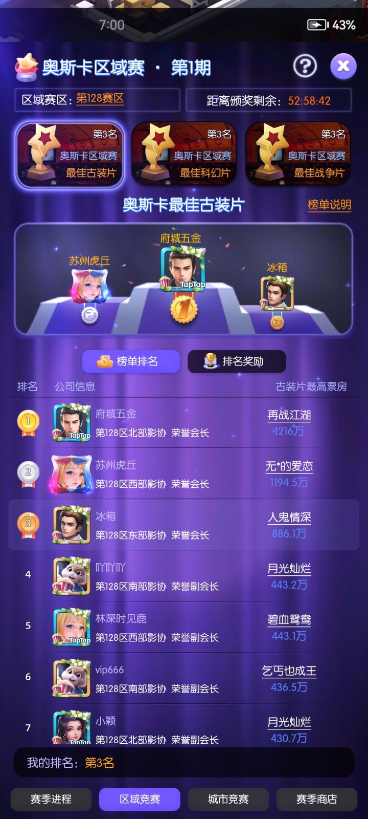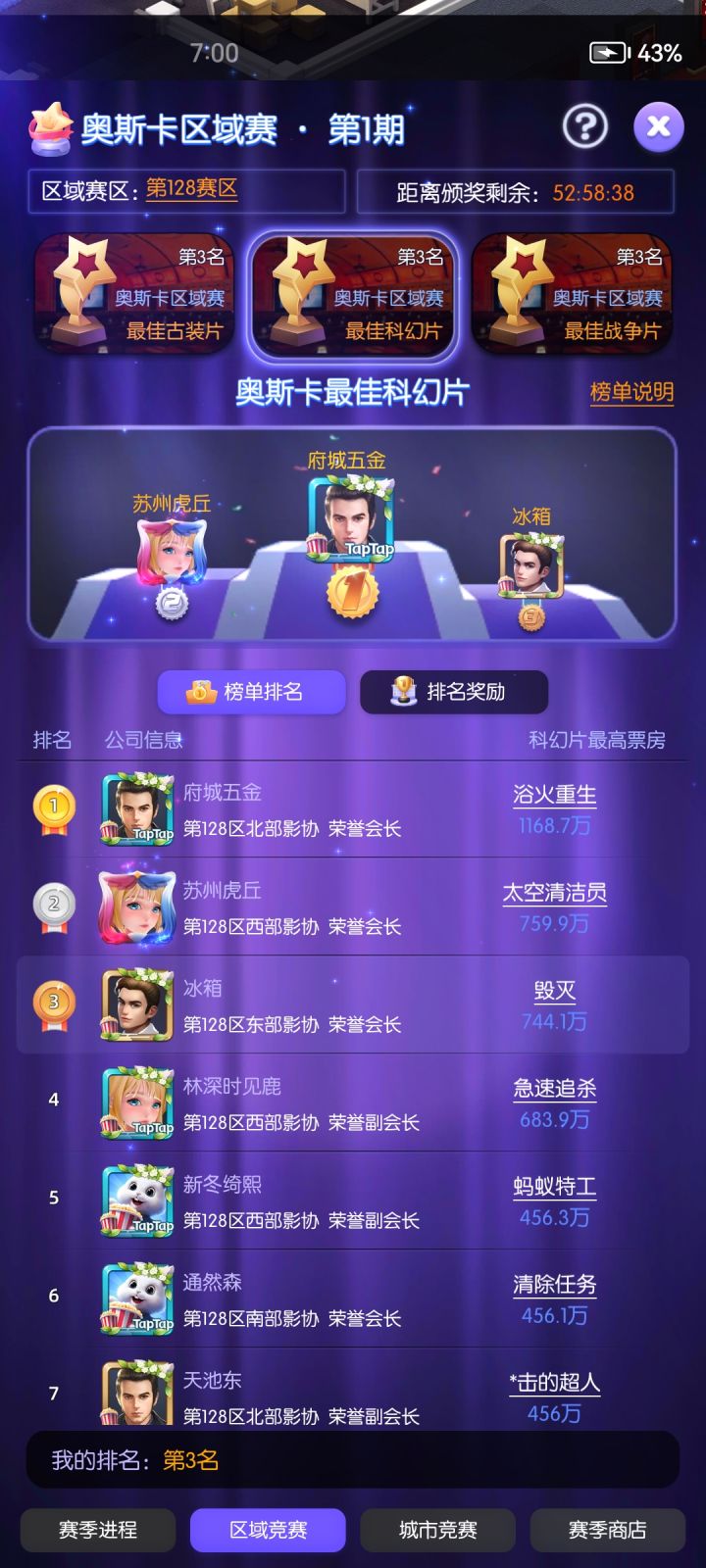 基本上大家今天就该轮到第一次奖项评选了,如果大家按照我的思路走基本上大家已经稳在七了,如果本赛区没大佬的情况下,恭喜你可以冲本区榜一,氪金大佬多的区也稳在前10。比如我这区有俩氪金大佬,一个稳8一个破8,但我们依旧能占前三。下面是些注意事项,因为是纯手工写攻略因此有些忘记说了。注意事项1:高星剧本作用比巨星作用大,至于怎么分配你的钻石抽剧本还是巨星,因为实际情况大家都不一样,因此没有办法说明。基