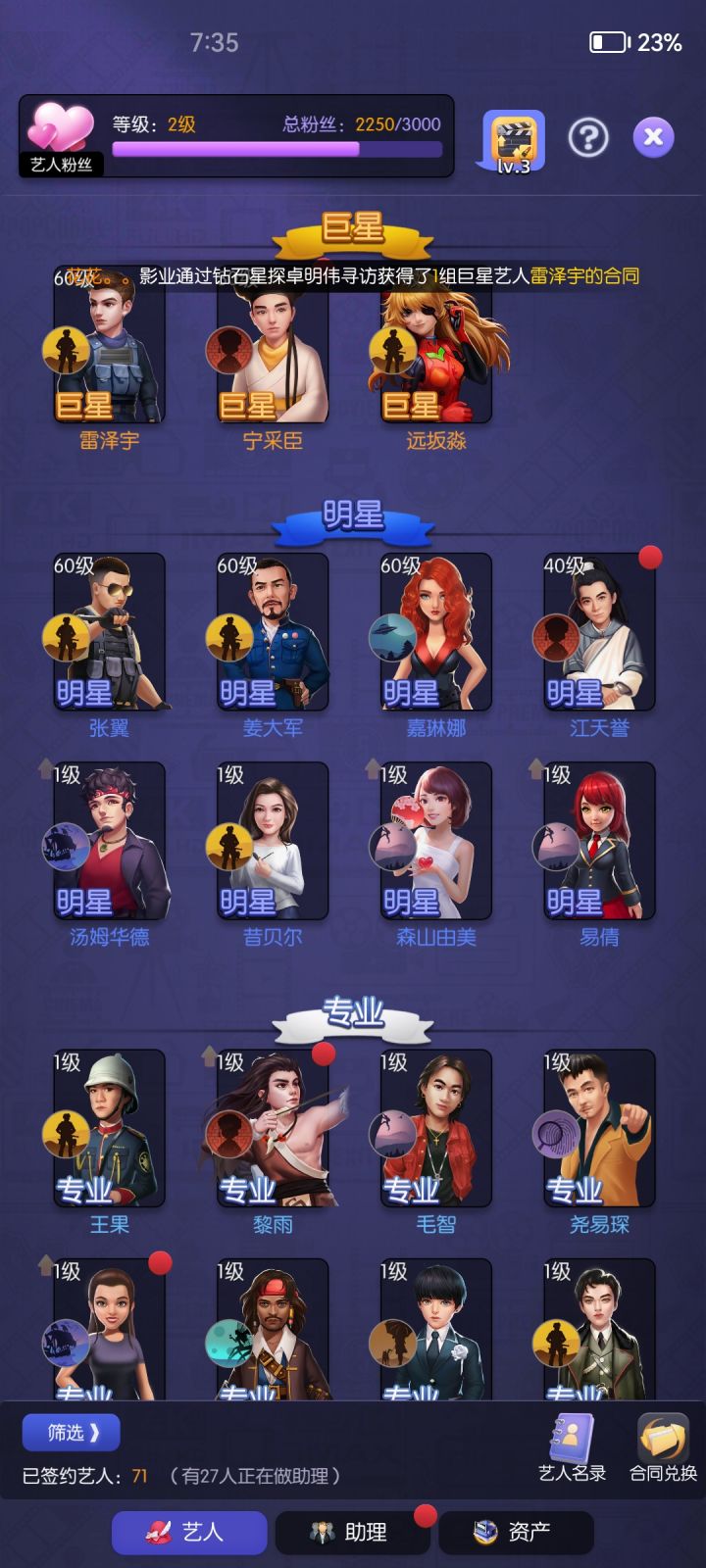 流程:开拍-选择档位-选择剧本-选择导演拍摄-选择艺人出演-选择拍摄类型-拍摄完-版权销售1.开拍点击右下角开拍,开启我们的下海拍片之路,拍摄需要消耗一张【拍摄许可证】2.选择档位点击开拍后进入选择档位界面,目前有1-7个档位,越高档位收益越高,,但相对的拍摄难度也会越高主要集中于对艺人的属性要求就拿我的号来说吧,既然能拍5档就选5挡开拍吧3.选择剧本选择档位后进入选择剧本,如果没充