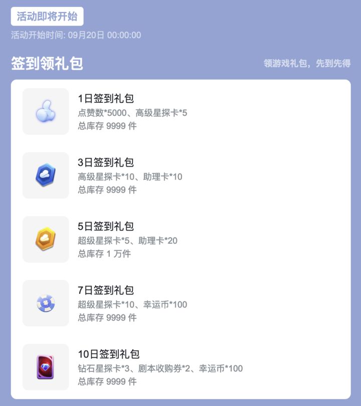 大伙多久没签到了呀?发个帖提醒下,咱们新一批签到礼包来了哦。传送门奉上:→→【】←←这次签到是1个月内签到10天就成,开始时间是周三,到时候大家记得来呀。【签到时间】9月20日-10月20日【签到奖励】累计签到即可获得对应天数的礼包(活动页面需在TapTap客户端打开才可进行领取噢)系统会根据连续签到的天数发放对应的兑换码,领取到兑换码可以进入游戏中进行兑换。礼包内容如下:礼