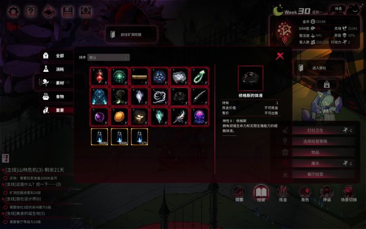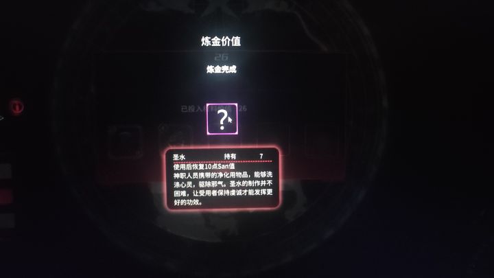 圣水回复10san值,炼金可以出,个人认为是炼金价值≥10的紫色物品有几率会是圣水