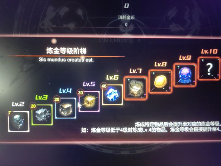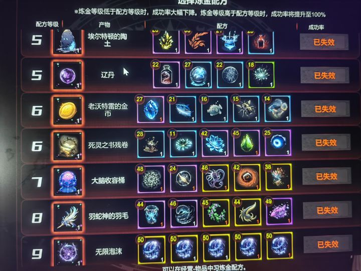 炼金造物的品质从低到高为白,绿,蓝,紫,金,即稀有度1、2、3、4、5(可能还有6)
