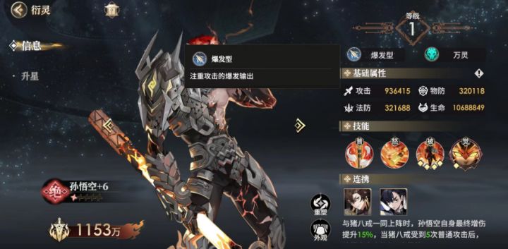 本攻略来自往期测试玩家深渊断罪本期为大家分享一下公测阵容推荐的系列攻略,希望能对各位小伙伴的游戏之旅有所帮助。本期为大家带来的是孙悟空爆发流阵容,从名字就可以看出,核心输出衍灵是孙悟空,而爆发流说的是孙悟空的衍灵定位。游戏中对于所有衍灵都有明确的定位划分,共分为爆发型、均衡型、防卫型和援护型。孙悟空是万灵阵营、爆发型衍灵,而爆发型的官方说明是注重攻击的爆发输出。阵容构成孙悟空+猪八戒+白