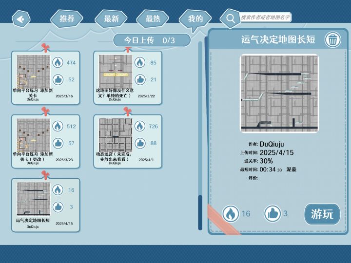 作者:123 难度:超五星(五星?) 考验功底的一张图,技巧不多,按暂停可以减少计时时间,机关同样能恢复 请大家多来看看【地图悬赏令】!!(好像时不时会更新) https://www.taptap.cn/moment/639068878156073308?share_id=84c7225822b3&utm_medium=share&utm_source=copylink