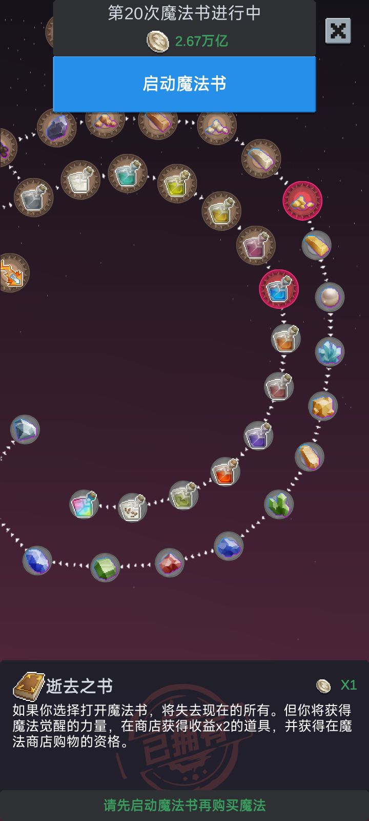 拥有第一个魔法币后,就可开启魔法书。魔法书的作用:(1)使用魔法币购买魔法,可开启游戏新功能,或者提升矿山收益。(2)转生后对矿山产出加成。转生后金币收益=矿山每秒产出*(1+累计魔法币数量/100)所以,拥有1个魔法币转生后提速1.01倍,微乎其微。当拥有1000个魔法币后,提速11倍;当拥有10000个魔法币后,提速101倍;以此类推。首次转生会给与2倍收益加成道具,帮助大家过
