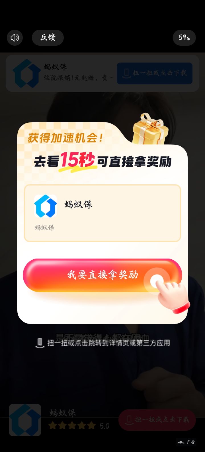 所以跟支付宝蚂蚁保有关的广告无法关闭,跳转后也无法获得奖励,今天早上全是这个广告