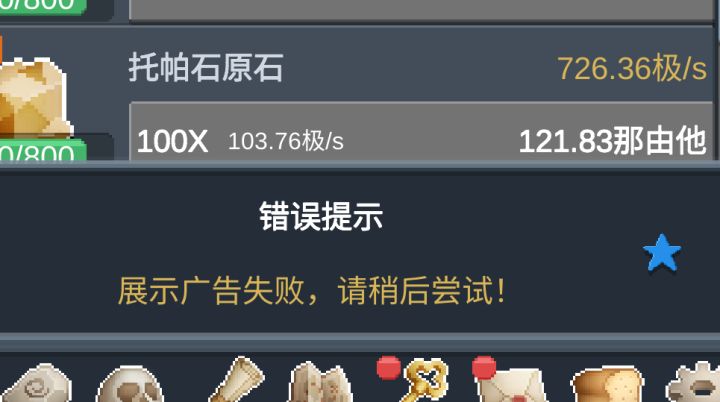 昨晚开始。规矩为:失败→成功→失败→成功→失败→成功→失败→成功而重点是第一次必定失败,所以进入游戏获取挂机收益看广告必定失败。那还挂个毛啊。要不挂机收益和恶魔之眼不要广告失败就消失,像其他几个看广告的界面可以再继续点击。
