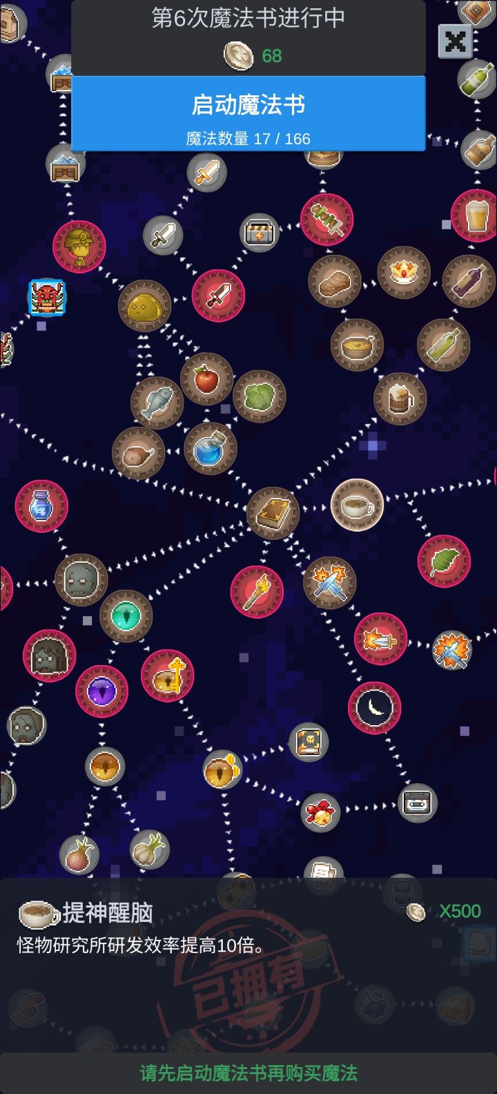 玩了几天了终于度过前期了,这游戏属于成长倍率几何增长的那种,前期属于魔法币很难解锁,局内成长也很慢,一开始解锁个逝去之术就可以直接重生了,然后攒到鱼肉果蔬都解锁再重生感觉这样收益最大,然后魔法币就没这么难拿了,后面还没玩到再看看吧