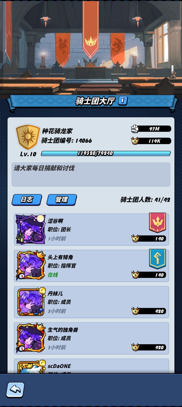 满级骑士团,讨伐每周稳定过8层,要求2500k以上战力,每天上线打讨伐,来的直接搜索骑士团编号14066。满了可以加我好友,我游戏ID1654129666
