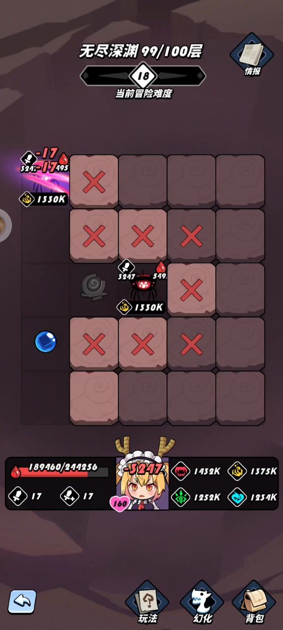 #游戏攻略 99层以前还正常,小怪四维的要求不超过20k,伤害不超过10,血量不超过10,但是BOSS很难打,我60层后面BOSS都是直接跳,100层BOSS要求9999999点意志,如果单点的话野能达到,但是95层的BOSS也要求要1000000+的属性,很难同时完成。如果不是想要挑战100层的话攻击+追击不用超过10,7、8点就够了,血量的话接近100血再+也行,如果怕自己运气不好可以先+3次