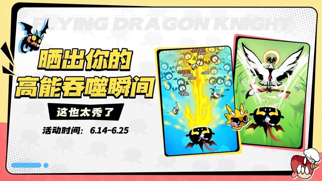 送京东卡!成为官方创作者,将扶植你成为明星玩家,帮你投流,为你作内容规划与指导,不会剪辑?不要紧!只要你愿意尝试,有想成为koc的意愿,那就尽管来吧! 6.14-6.25,前往抖音平台,晒出你的高能吞噬瞬间,可以是吞子弹,可以是吞怪兽,视频时长15s,带上#飞吧龙骑士话题,并@飞吧龙骑士官方抖音账号,本喵会选出前十名玩家送上京东卡奖励,并进入官方创作者群,快人一步获得最新游戏进度,直接与官方对接!