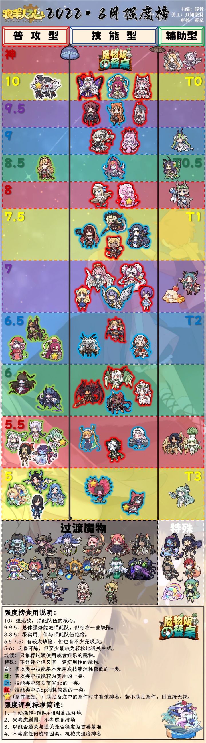 详细攻略的坑终于填了,之前只有一张图,很多细节没有说,榜单分为输出和辅助,每个层级排满会往下层排。综合排名依据包括:1破1-70级强度,操作难度,养成难度,满破强度等。精选榜是选择非常强力的魔物,榜单会随着更新有所变化。输出榜T0:人权级珈百璃非常特殊,拥有辅助和输出两个优秀能力,5秒的混乱等效的生存能力在推图中可以扭转战局,甚至配合圣天使可以一直混乱敌人,对于不免疫控制的关卡就是绝杀。输出
